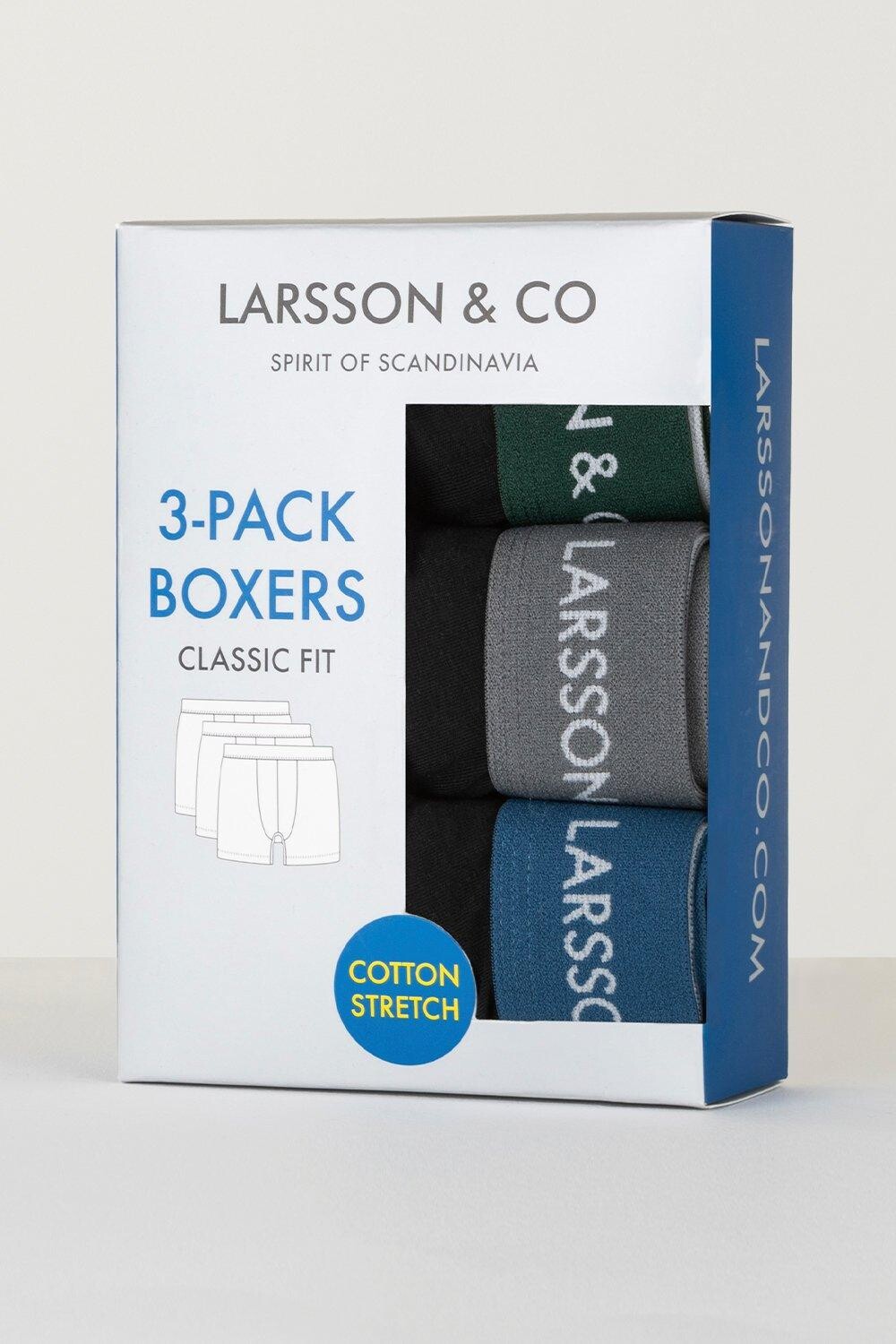 Найдите идеальное сочетание комфорта и стиля с этими тремя наборами боксеров от Larsson & Co. Эта упаковка имеет фирменную ленту и классический крой, создавая скандинавский стиль, который никогда вас не подведет.