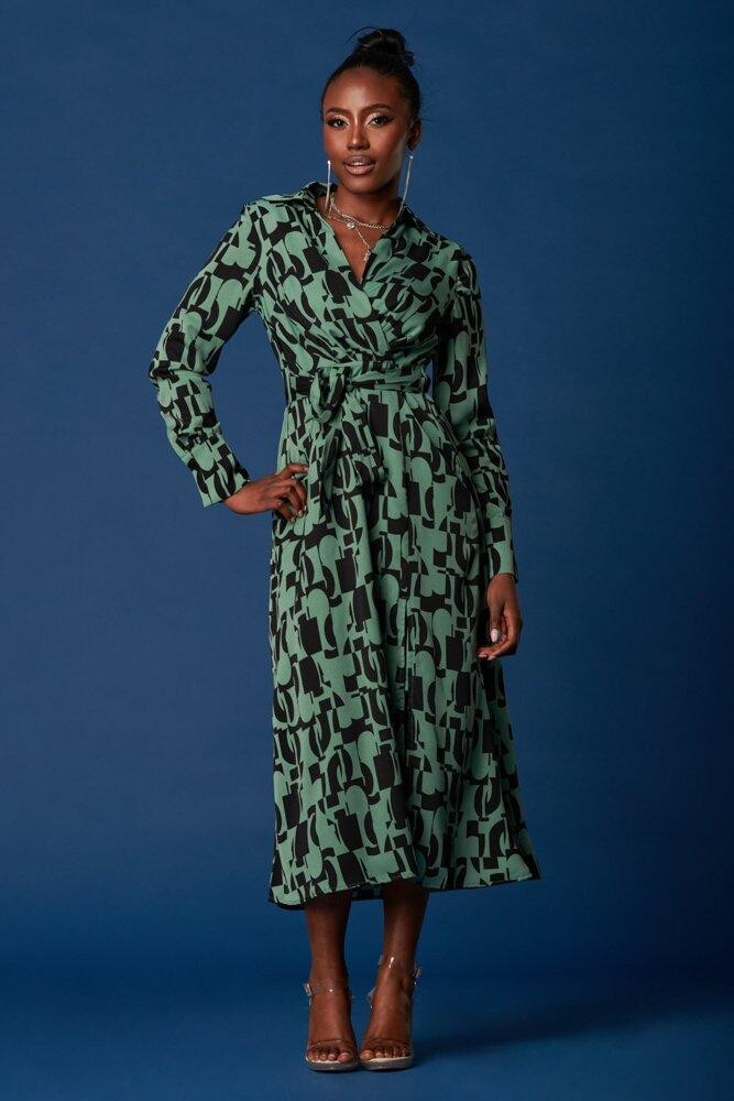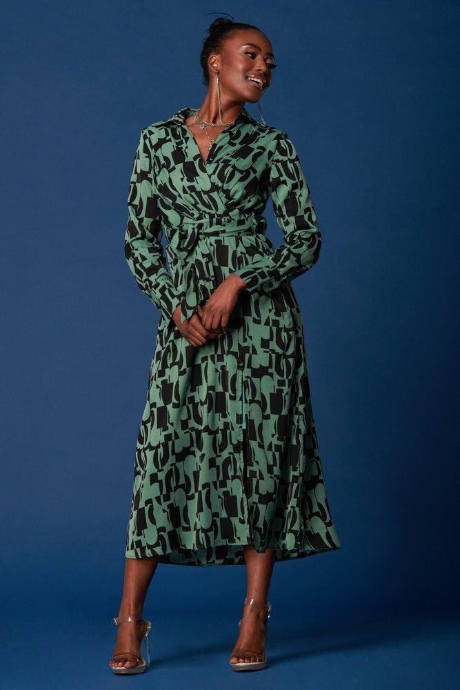 Обновите свой гардероб этим платьем-макси с запахом и рубашкой от Jolie Moi. Дополняется модным принтом с геометрическим узором, длинными укороченными рукавами на пуговицах и V-образным вырезом с воротником, который драпируется и расширяется до пола.