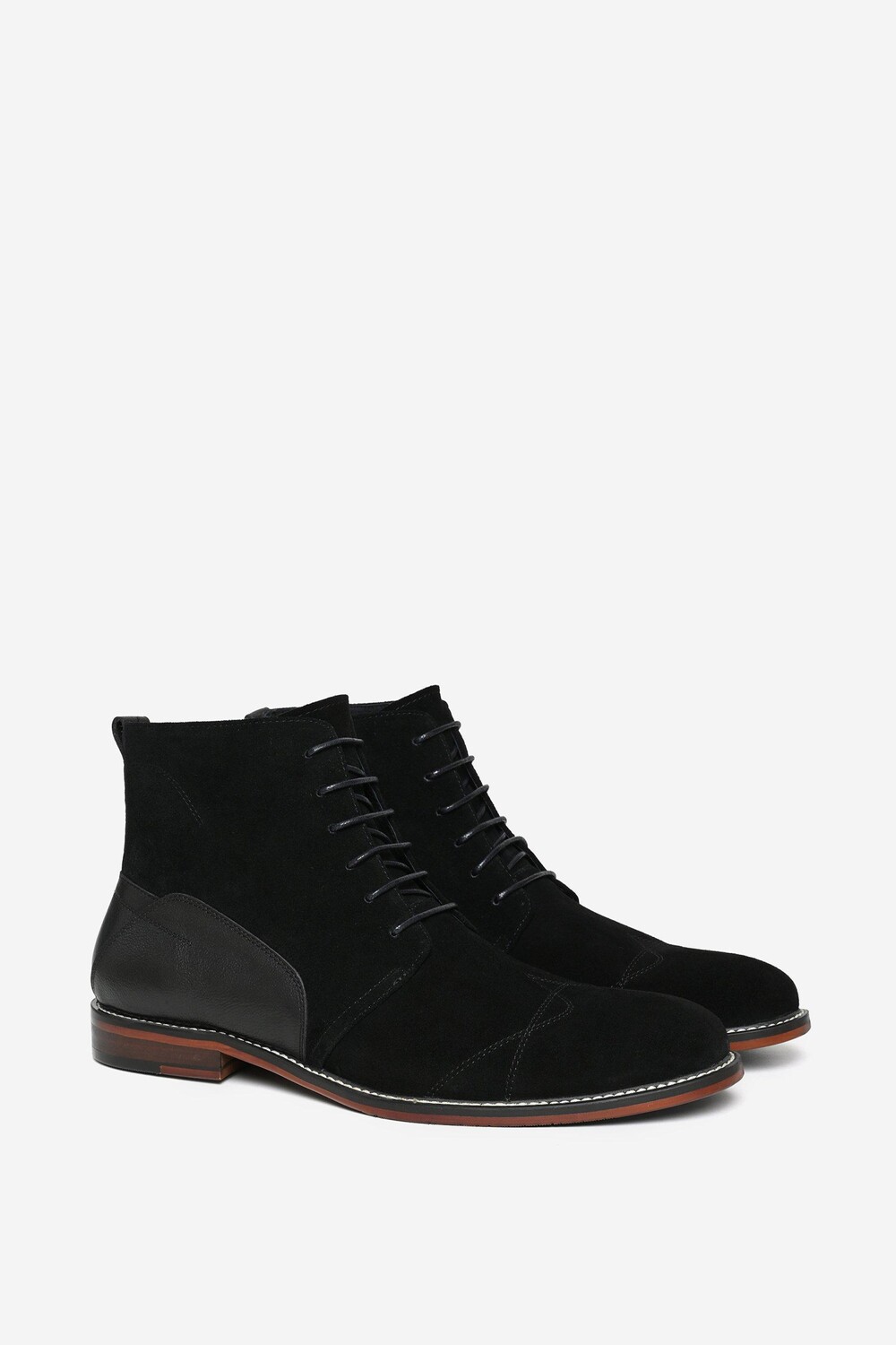 Ботинки премиум-класса из замши и кожи с вощеной шнуровкой с 6 глухими люверсами, стежками на носке и кожаной опорой пятки. Подошва исключительного качества с темно-синим рифлением для устойчивости и стиля. Идеальные ботинки для повседневного или элегантного ношения.