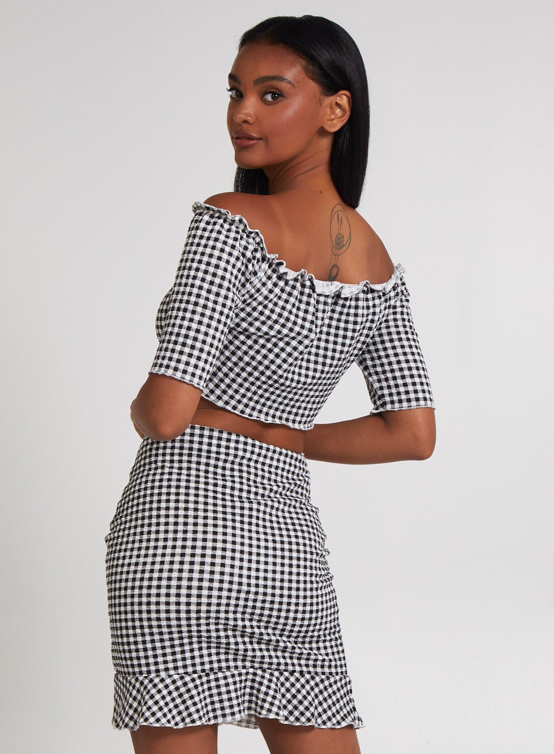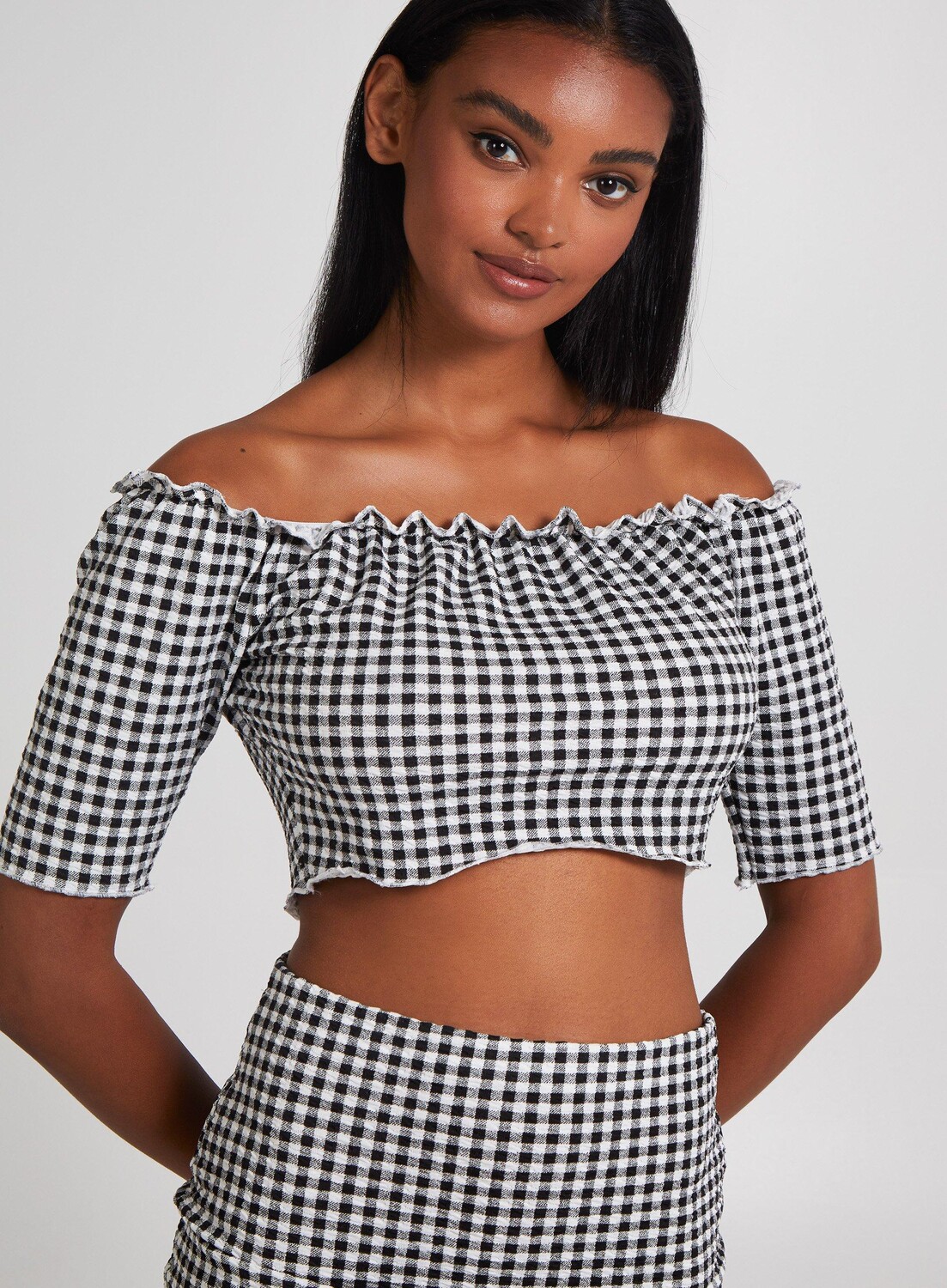 Топ в клетку с оборками и открытыми плечами Pink Vanilla, черный