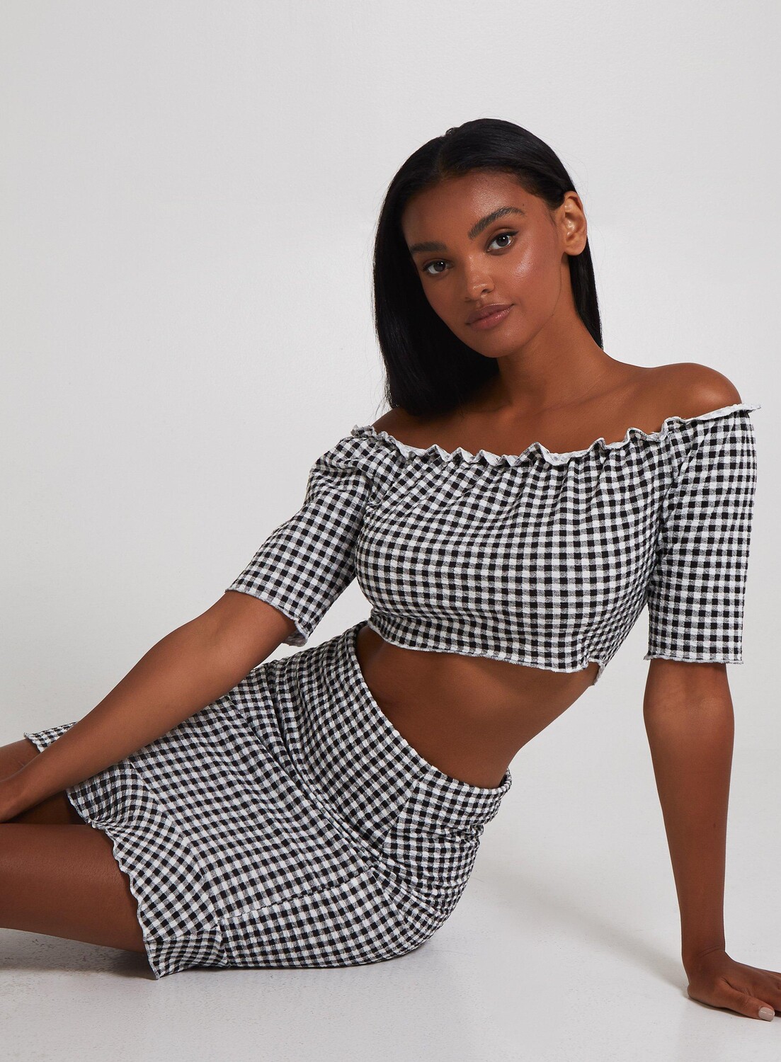 Топ в клетку с оборками и открытыми плечами Pink Vanilla, черный 2 627₽