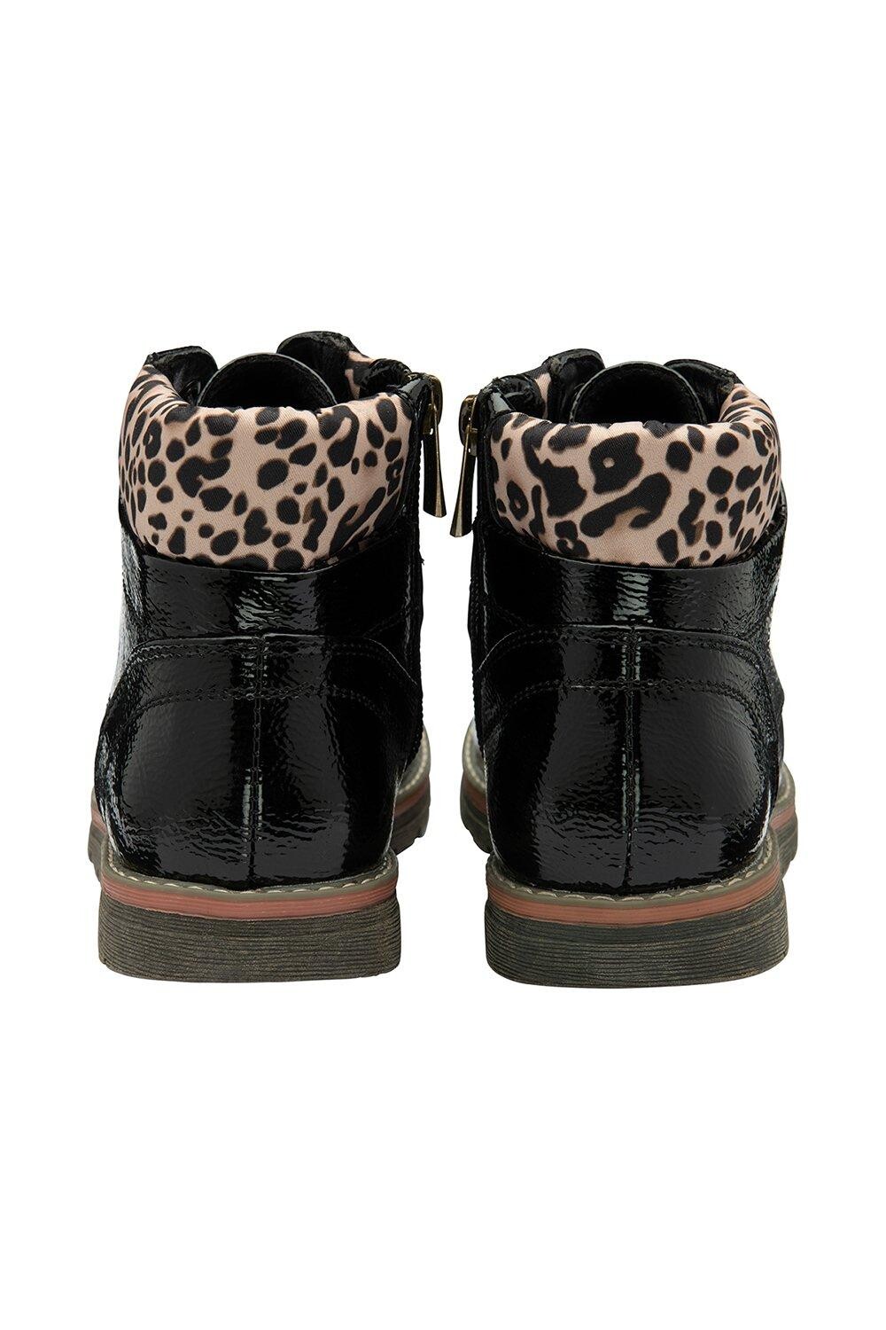Элементы тренда хайкерских ботинок очевидны в ботинках Lotus Lexis со шнуровкой. Эти блестящие лакированные ботинки имеют модный воротник на щиколотке с леопардовым принтом, металлические люверсы и зубчатую подошву, придающую им современный вид.