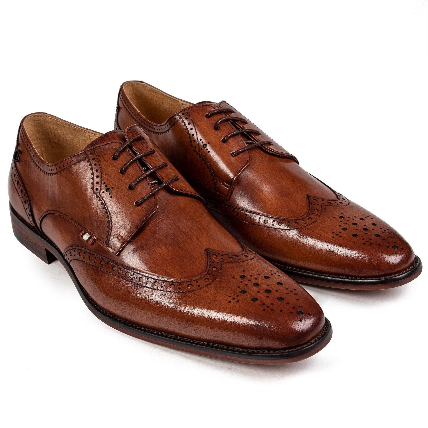 Мужские светло-коричневые броги Simon Carter Beagle на шнуровке с кожаным верхом, классической прошитой вручную законцовкой крыла и дыроколом. Эти деловые туфли имеют тканый полосатый язычок на союзке, кожаную подкладку, носок с принтом и коричневую синтетическую подошву с тиснением в тон.