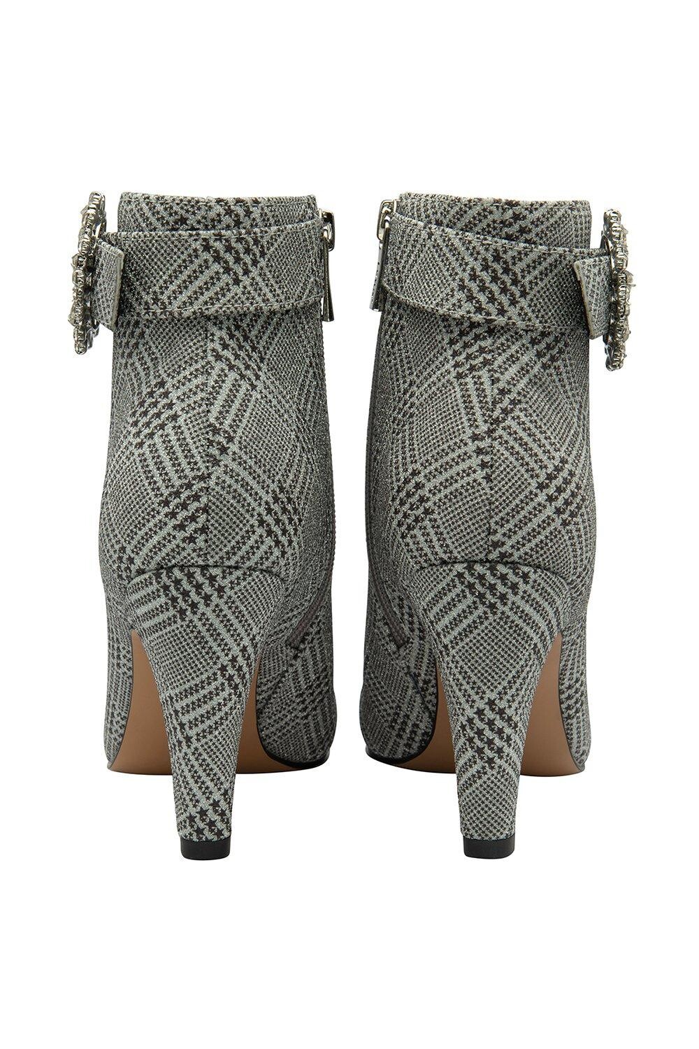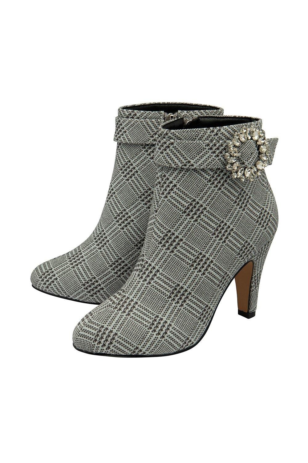 Ботильоны Lotus Adele выглядят смело, но гламурно: верх из текстиля с принтом в серебряную клетку и мерцающей отделкой украшен большой брошью из бриллиантов. Эти ботильоны Lotus с миндалевидным заостренным носком, каблуком-шпилькой высотой 9 см и внутренней молнией, облегчающей надевание и снятие, представляют собой практичное и стильное предложение, которое сочетается с множеством образов.
