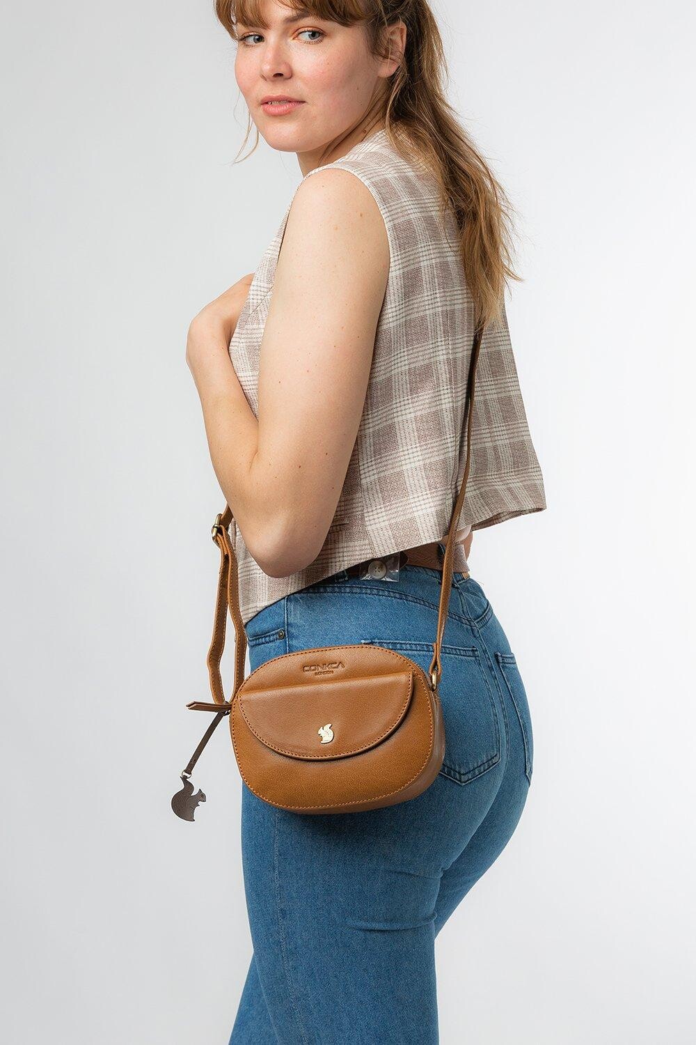 Сумка через плечо Una от Conkca London изготовлена вручную из разноцветной кожи, что придает ей красивый вид. Верх на молнии открывается, открывая просторное, но компактное основное отделение с двумя накладными карманами на подкладке из натурального и необработанного 100% хлопка. Карман спереди на магнитной кнопке и накладной карман сзади обеспечивают хранение вещей в дороге. В комплект входит регулируемый кожаный ремешок с максимальной длиной 68 см. Украшено неповторимой подвеской в виде белки Conkca и логотипами Conkca.