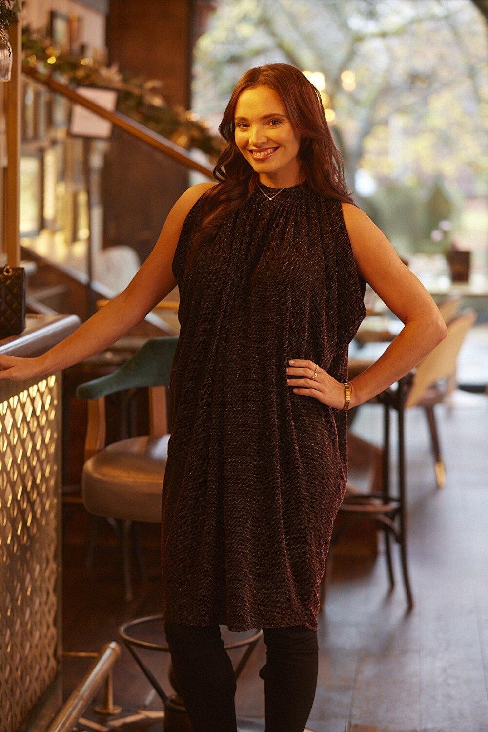 Подготовьтесь к праздничному сезону с этим классическим свободным платьем длиной до колена без рукавов, украшенным множеством блесток, создающих эффект мерцания. Прекрасно подчеркивает фигуру, не жертвуя комфортом и воздухопроницаемостью.