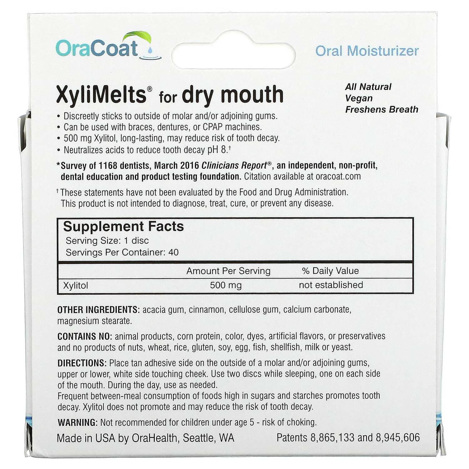 Увлажняющие диски для снятия сухости во рту от OraCoat XyliMelts - это диски, которые приклеиваются к зубам или деснам и облегчают симптомы стойкой сухости во рту. Увлажняющие диски для снятия сухости для полости рта OraCoat XyliMelts можно использовать днем и ночью, их продолжительность между нанесениями составляет 4–8 часов в зависимости от выработки слюны (индивидуальные результаты могут отличаться).