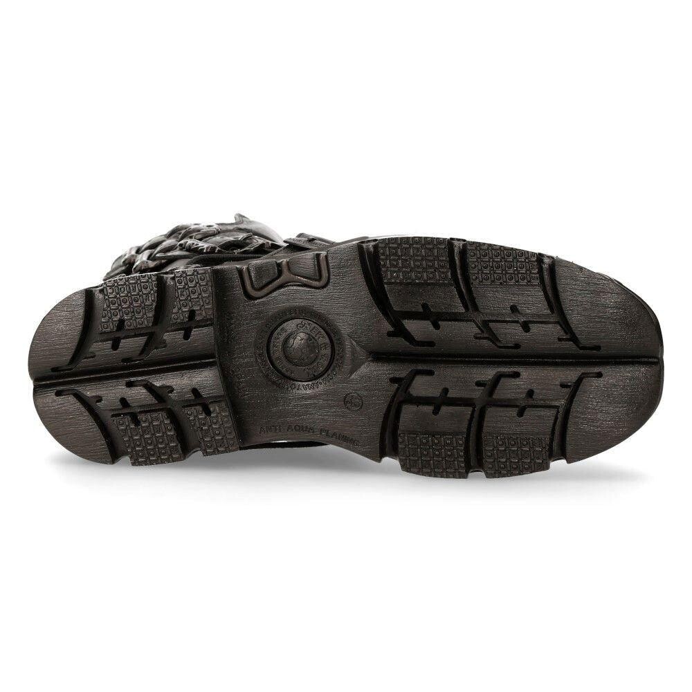 Эти ботинки до середины икры изготовлены из коровьей кожи премиум-класса и отличаются качеством, отражающим многолетний опыт создания обуви премиум-класса, который New Rock с гордостью накопил. Эти ботинки, входящие в культовую линию реактора, украшены разнообразными черными металлическими деталями, которые придают образу характерный готический вид. На подошве имеются черные прочные металлические вставки, а также пряжки в виде черепа и логотипы New Rock на верхней части, выполненные из металла, что придает этим ботинкам элегантный вид. Для придания ботинкам глубины резиновая пятка и подошва подняты на высоту 6 см и 3 см соответственно, что придает этой обуви смелый вид, олицетворяющий суть готической моды. Верх из черной кожи премиум-класса, высота голенища 22 см. €¢ Металлические пряжки с изображением черепа черного цвета. Резиновый каблук высотой 6 см и подошва высотой 3 см.