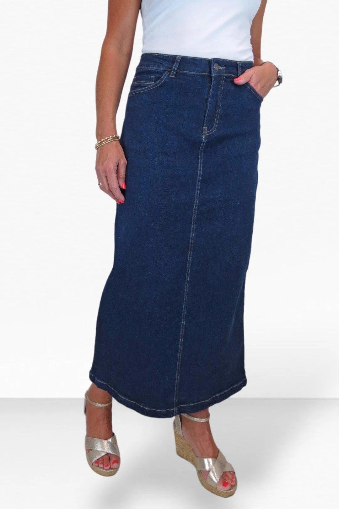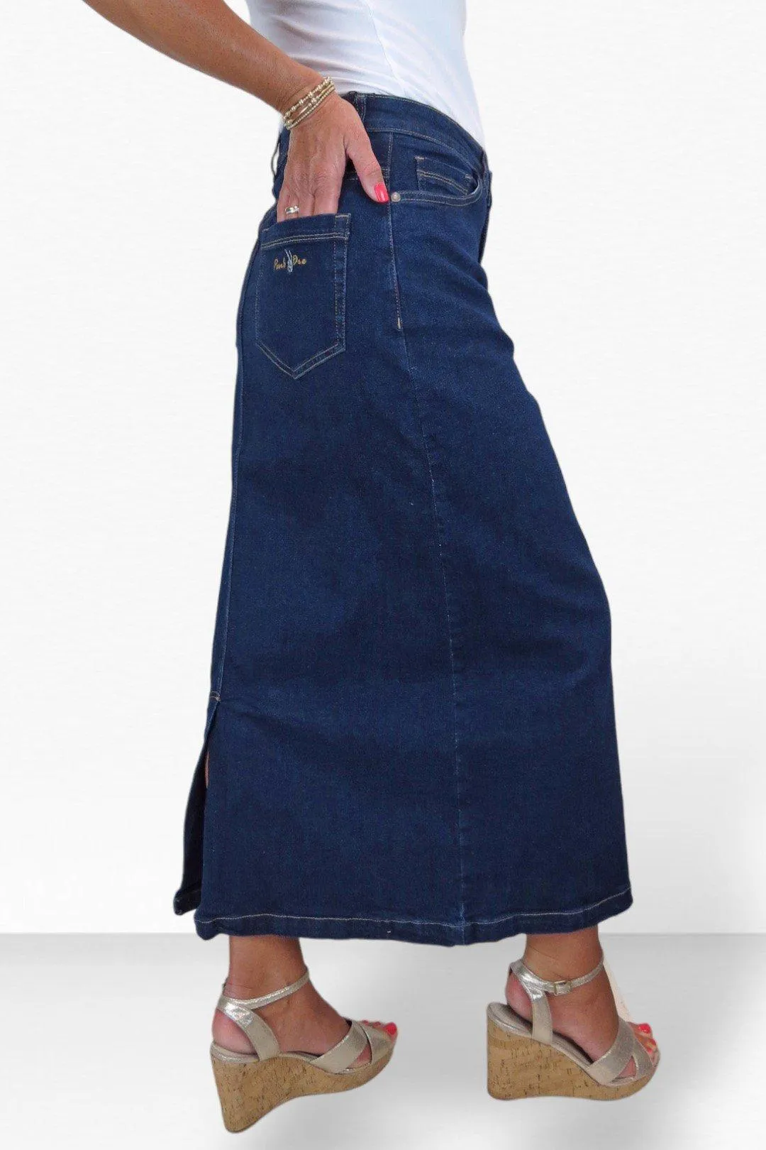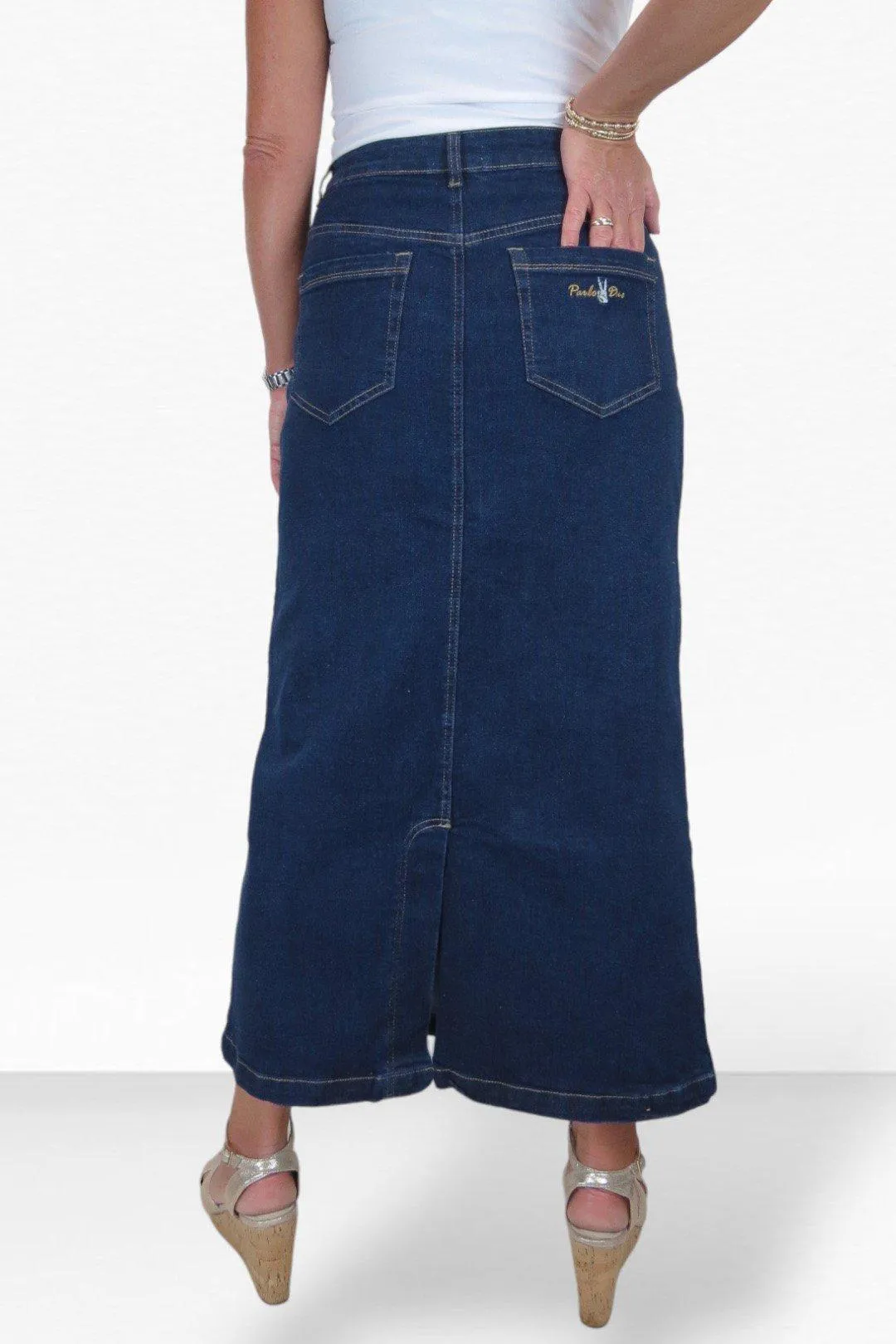 Джинсовая макси-юбка стретч от Paulo Due. Женская юбка-макси изготовлена из очень мягкого и эластичного джинсового материала для максимального комфорта. Он имеет прямой крой и классический джинсовый дизайн с пятью карманами: 3 передних и 2 задних кармана. Джинсовая юбка имеет серебряную пуговицу и молнию-ширинку для практичной застежки. Длиной спереди 35 дюймов (91 см) оно обхватывает лодыжку. Со свитерами зимой или с майками летом — это джинсовое макси можно носить круглый год! Дополните повседневный образ парой ботинок. или кроссовки для создания невероятно модного образа!