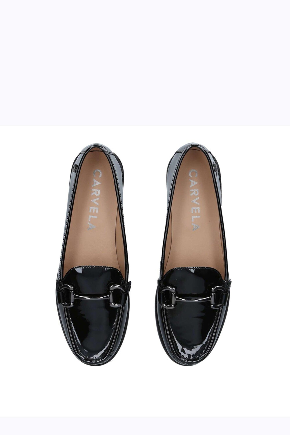 Лоферы Snap от Carvela имеют черный лакированный верх с золотой заколкой спереди.