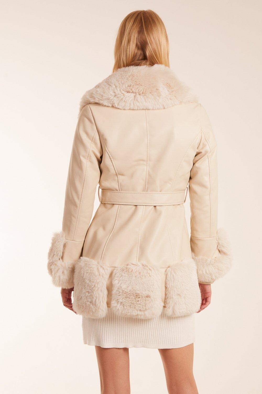 Элегантное пальто из искусственного меха с завязкой на талии.