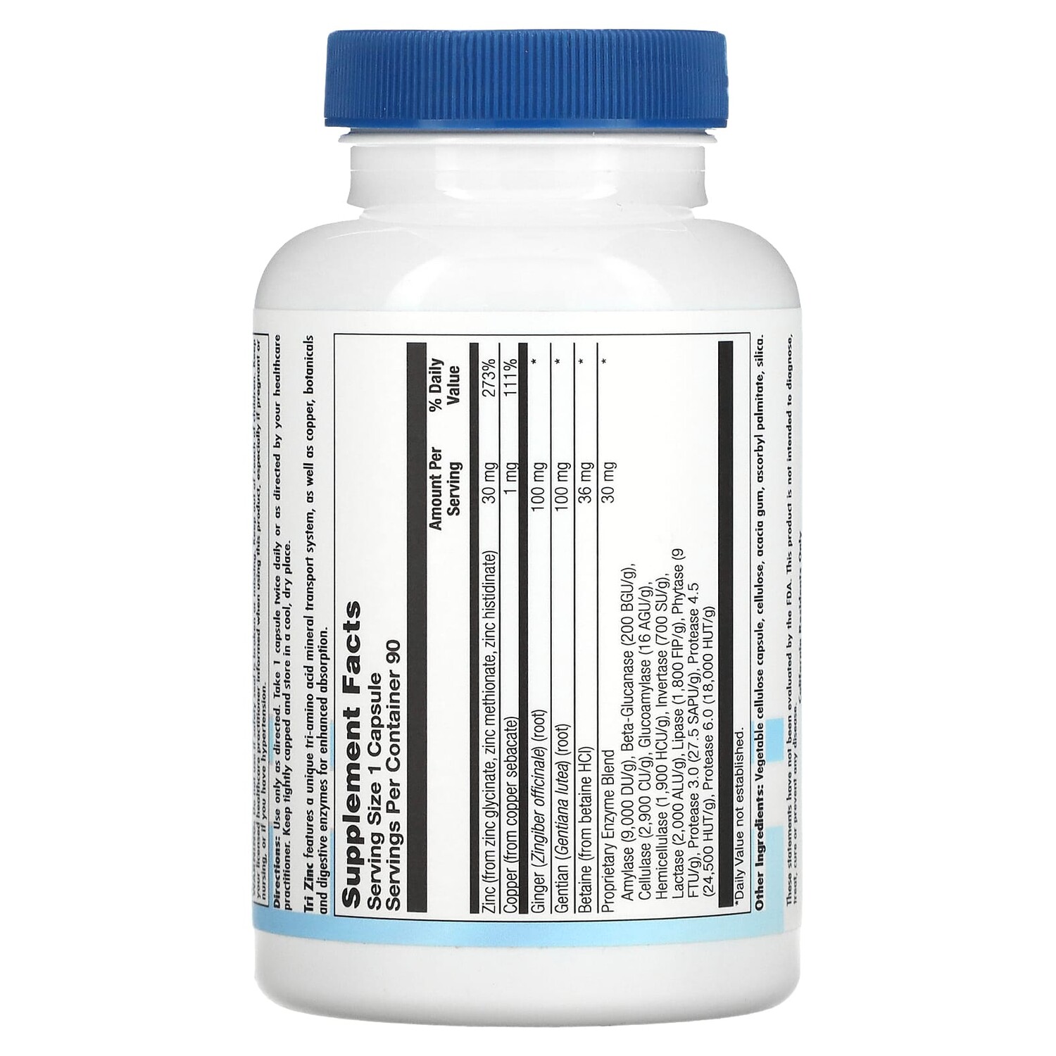 Пищевая добавка. Tri Zinc обладает уникальной системой транспортировки минералов из трех аминокислот, а также медью, растительными компонентами и пищеварительными ферментами для улучшения усвоения.