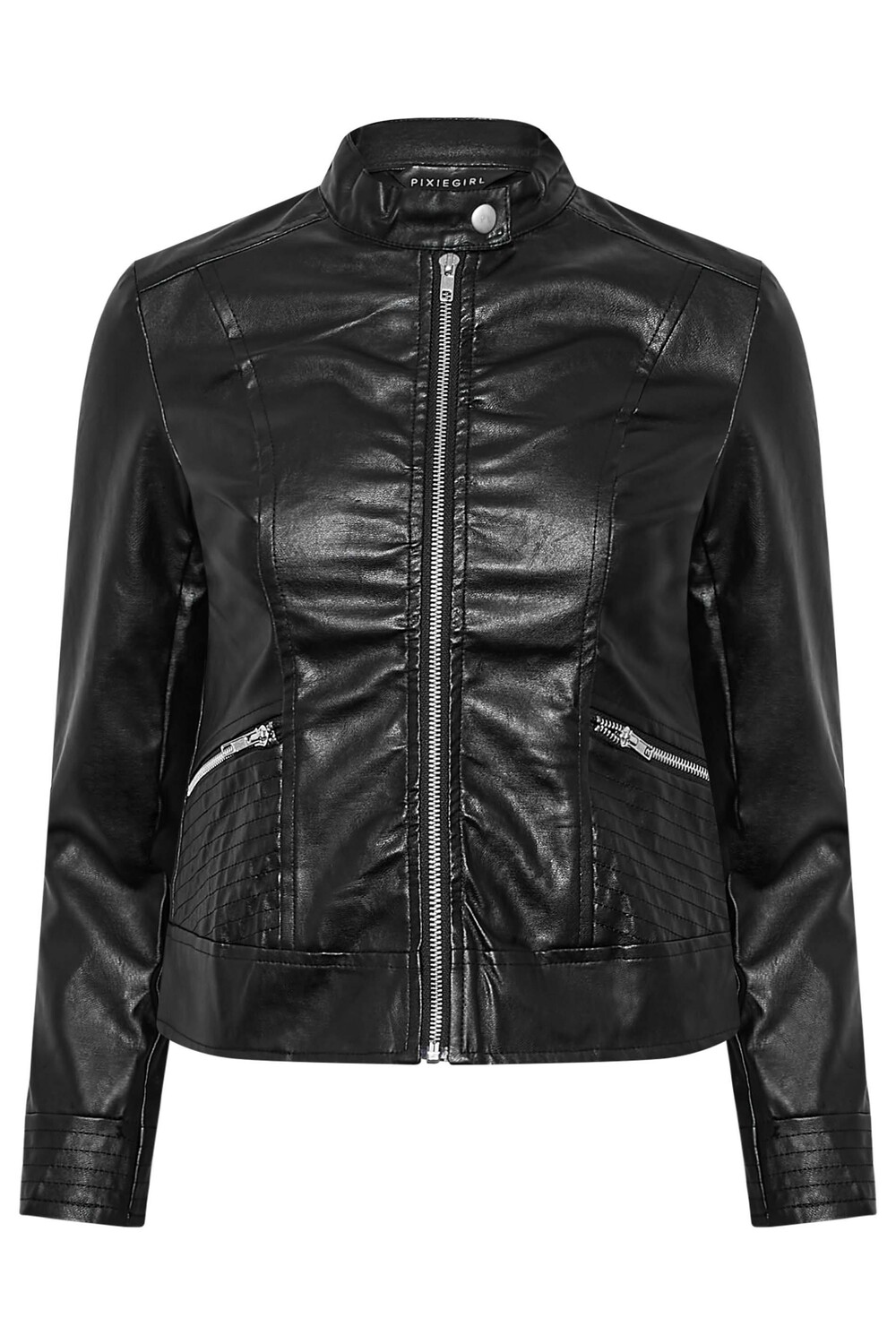 Добавьте эту куртку без воротника от PixieGirl в свою коллекцию нового сезона. Модель выполнена из мягкой искусственной кожи, имеет длинные рукава, застежку-молнию и два боковых кармана на молнии. Просто наденьте джинсы и футболку для повседневного стиля.