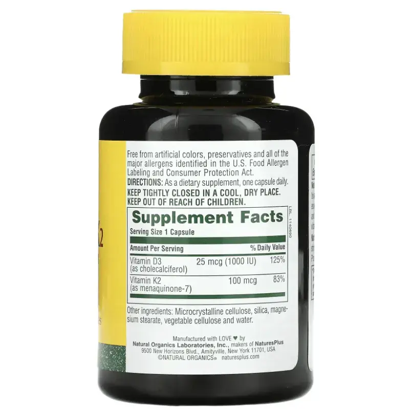 Natures Plus® Vit D3 + Vit K2 использует наиболее биодоступные и эффективные питательные формы этих основных питательных веществ для костей для оптимального усвоения и использования: витамин D3 (холекальциферол) и витамин K2 (менахинон-7).