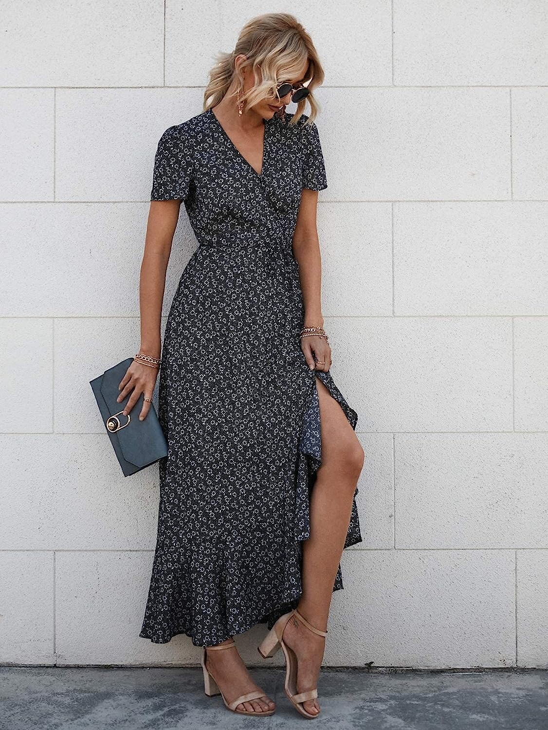 Особенности: V-образный вырез, короткие рукава, свободная посадка, высокая талия, асимметричная отделка с оборками внизу, высокий разрез с одной стороны, пояс с запахом на талии