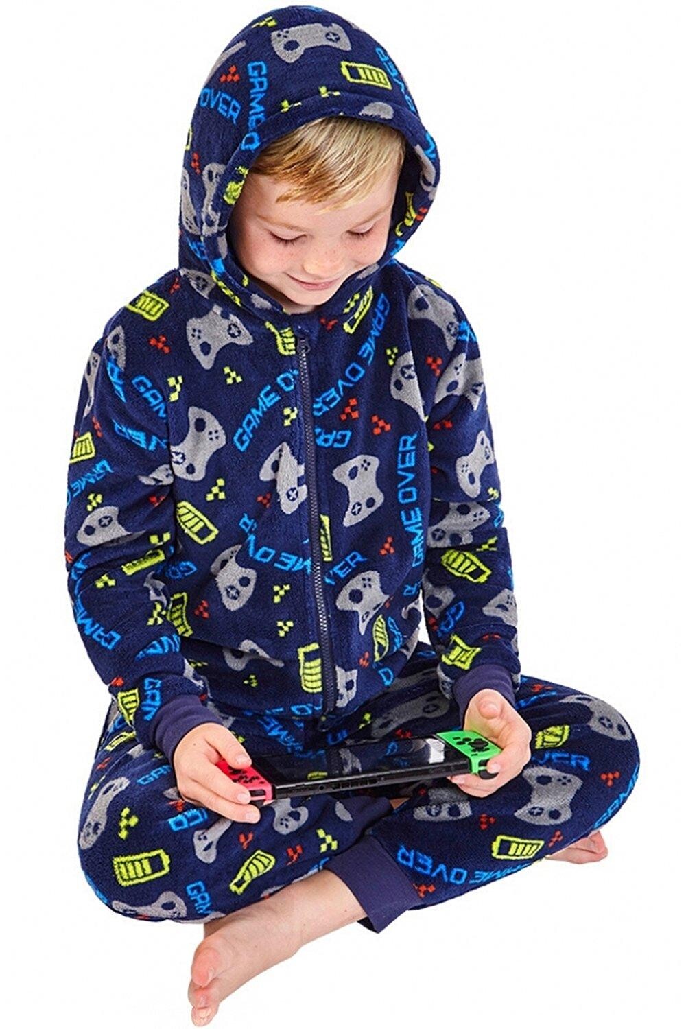 Детский супермягкий комбинезон с игровым принтом - идеально подходит для детей старшего возраста и в качестве подарка! Повсюду принт с изображением Game Over! лозунг. Молния спереди, рукава и штанины с манжетами. Не подходит и не предназначен для ношения в качестве одежды для сна. Код продукта: 01-КОН13.