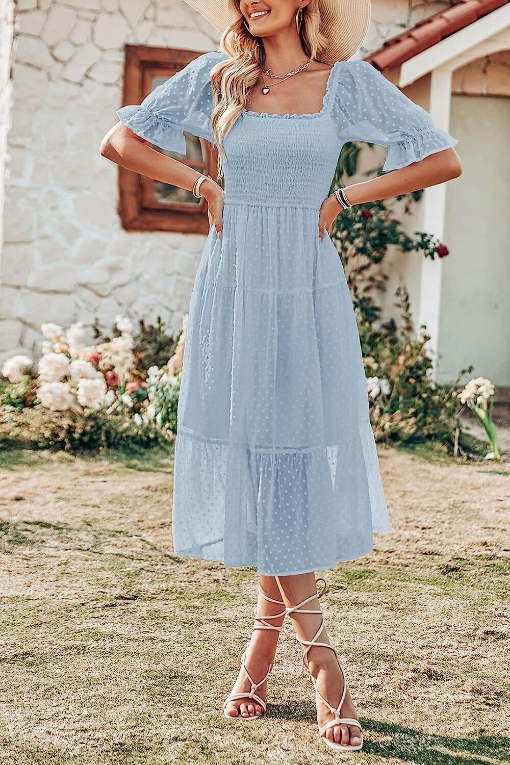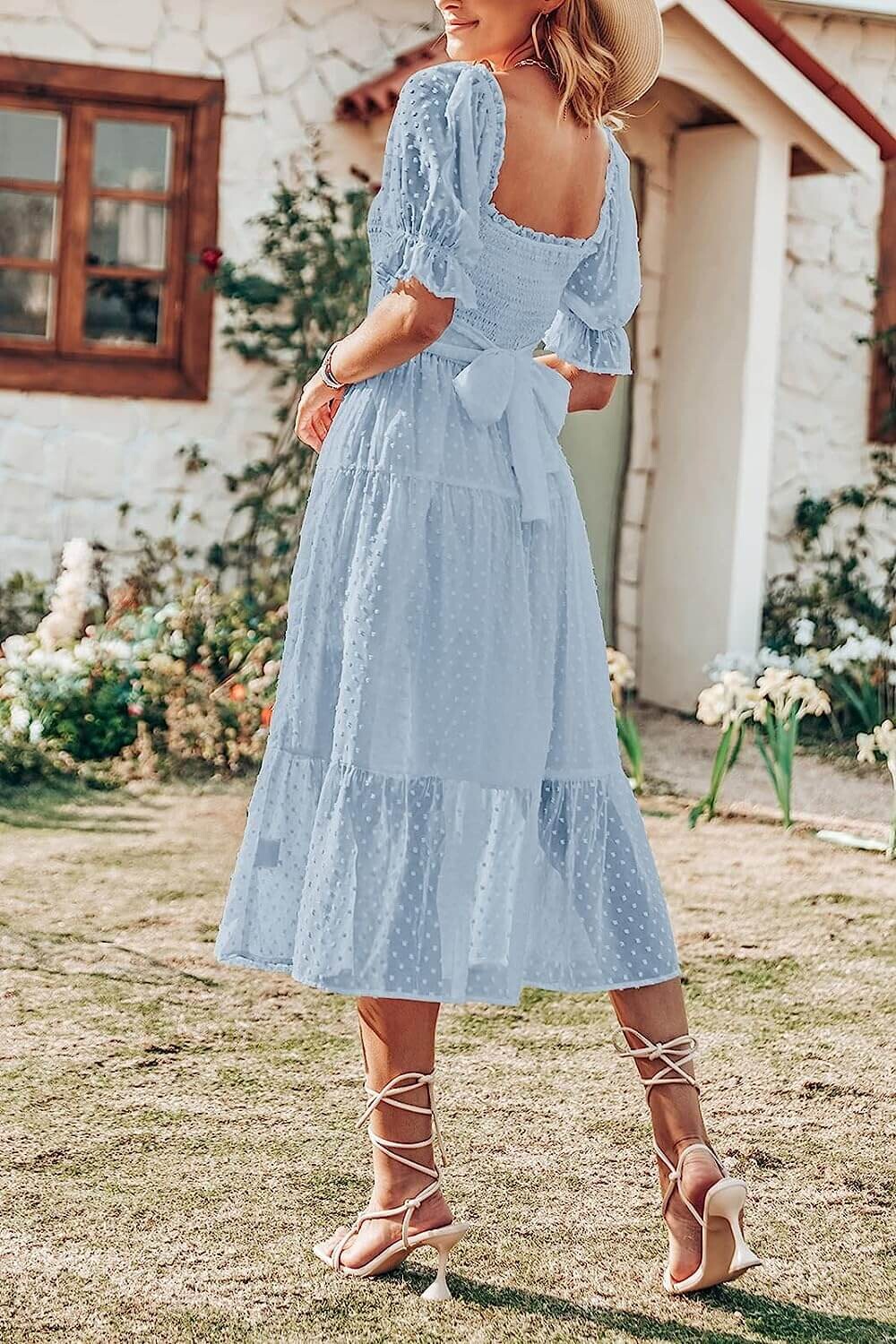 Летнее платье миди в стиле бохо с квадратным вырезом и пышными рукавами.