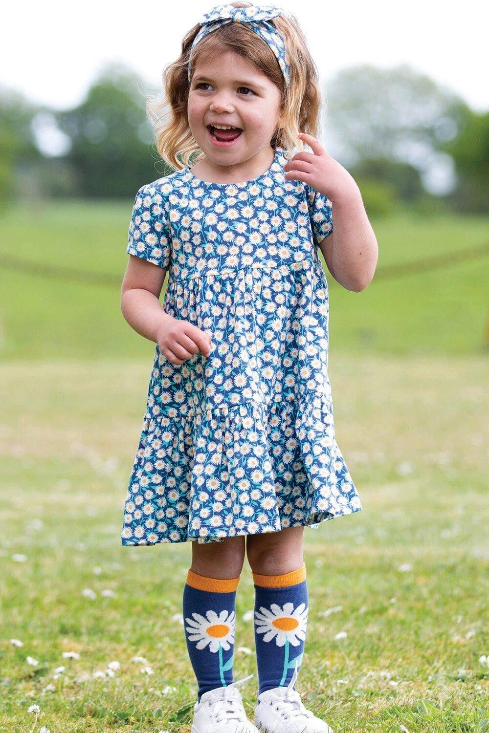 95% органический хлопок, 5% эластан. Мы гордимся тем, что компания Control Union сертифицирована по Глобальному стандарту органического текстиля (GOTS). Принт «Ромашки в полях» по всей поверхности. Темно-синий. Одинарный трикотаж, немного тянущийся. Многоярусная пышная юбка. Открытие плеча на кокосовой пуговице (размер до 3 лет включительно). Короткие рукава со сборками. Круглая шея. В наличии соответствующие товары. Сделано в Турции. Можно стирать в машине при 40 градусах или при 30 градусах, чтобы беречь планету.