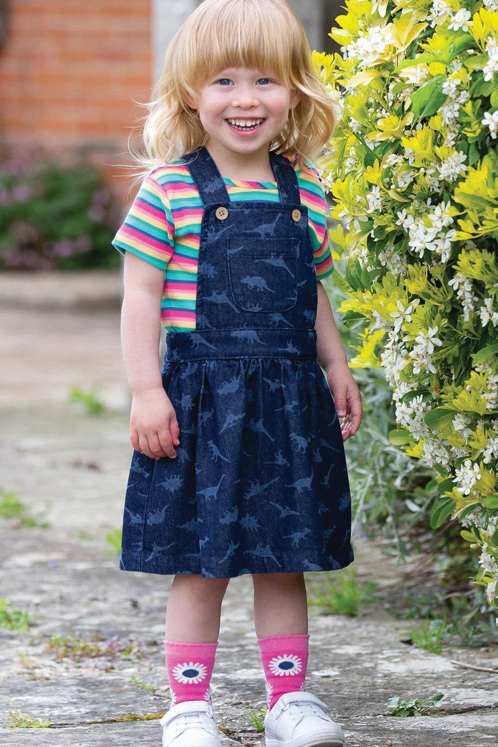 Идеальный передник — то, что нужно вашему маленькому любителю динозавров! Это платье с передним карманом, регулируемыми бретелями и эластичным поясом просто великолепно. Он отлично смотрится со многими топами этого сезона, особенно с радужной футболкой, которая добавляет веселья и цветового контраста.