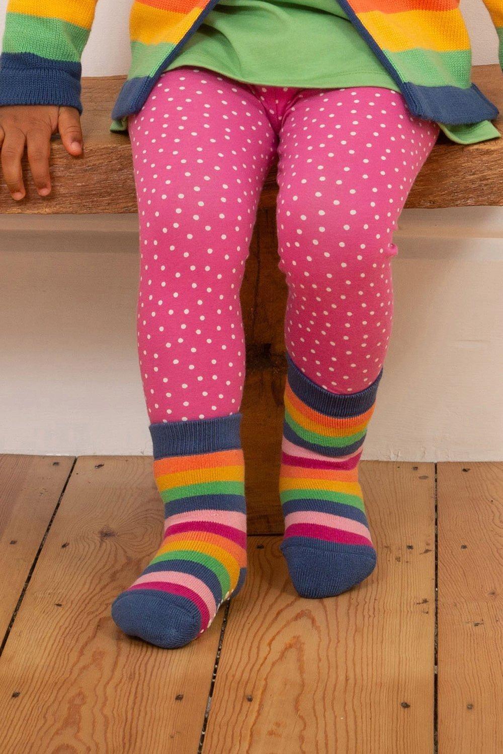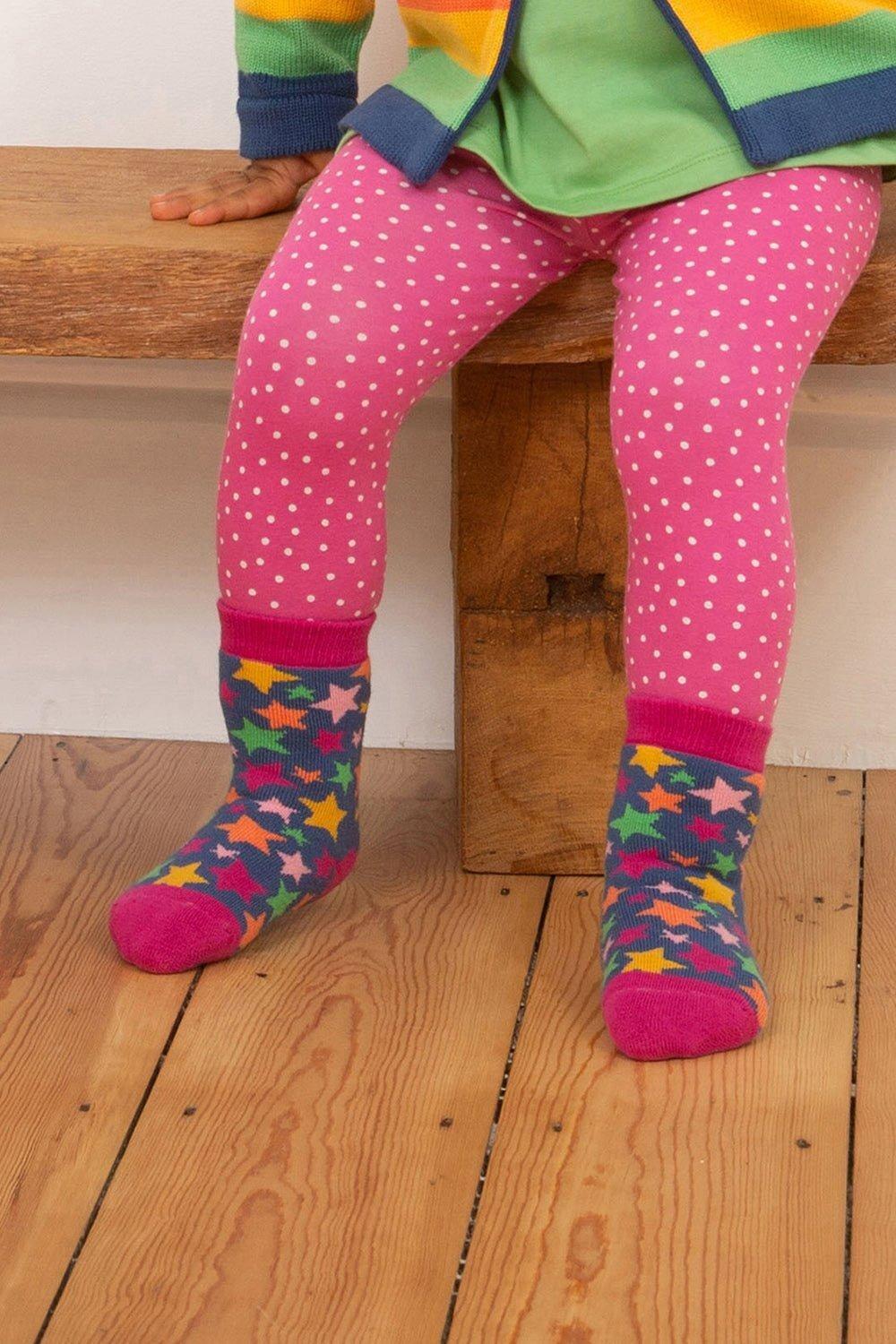 Сверхмягкие носки из органического хлопка с узором «суперзвезда» и радужными полосками. Благодаря удобным цепким пятнам на подошве они идеально подходят для малышей, которые умеют ставить ноги на ноги, и для малышей, которые рвутся вперед! Они дополнят любой наряд и станут отличной идеей для подарка.