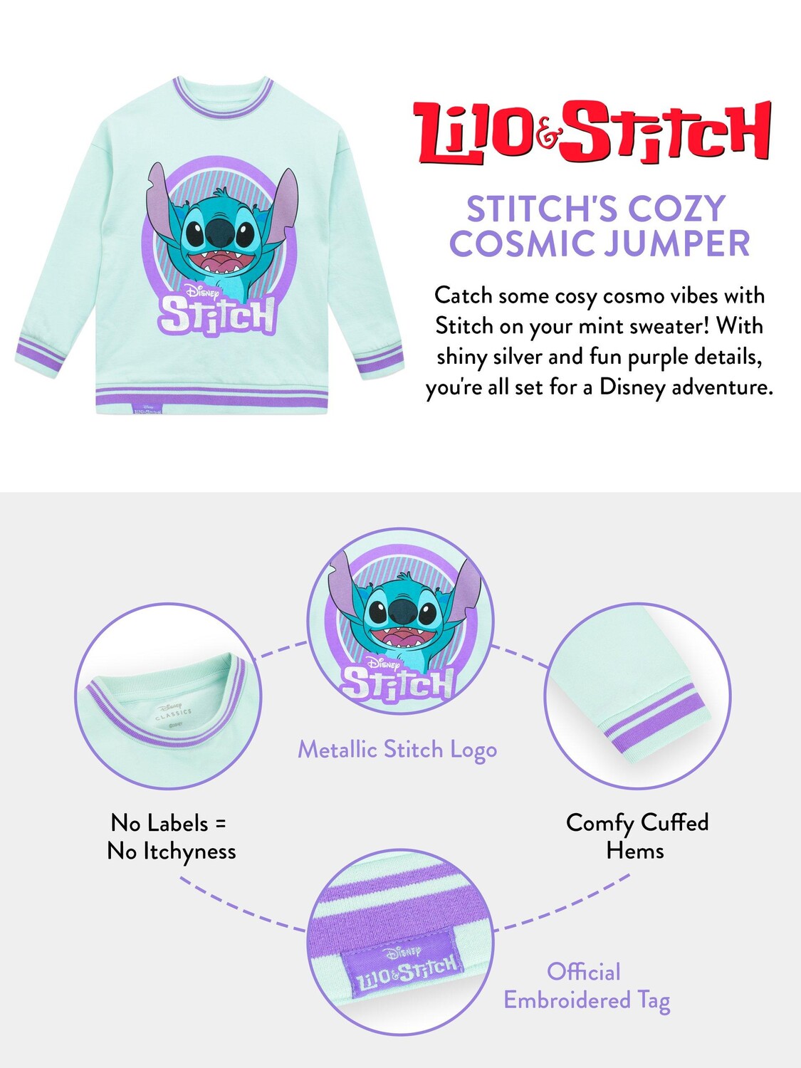 Приготовьтесь сшить идеальный наряд! Этот яркий бирюзовый джемпер украшен невероятно большой вышивкой в центре фиолетового круга на фоне прохладных синих и фиолетовых полос. Этот джемпер, подчеркнутый мерцающими металлическими логотипами Disney Stitch и игривыми фиолетовыми штрихами на манжетах, воротнике и подоле, станет незаменимым аксессуаром для каждого любителя Stitch. И не пропустите милый тег «Лило и Стич» — все дело в деталях!