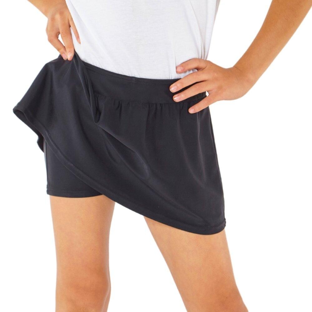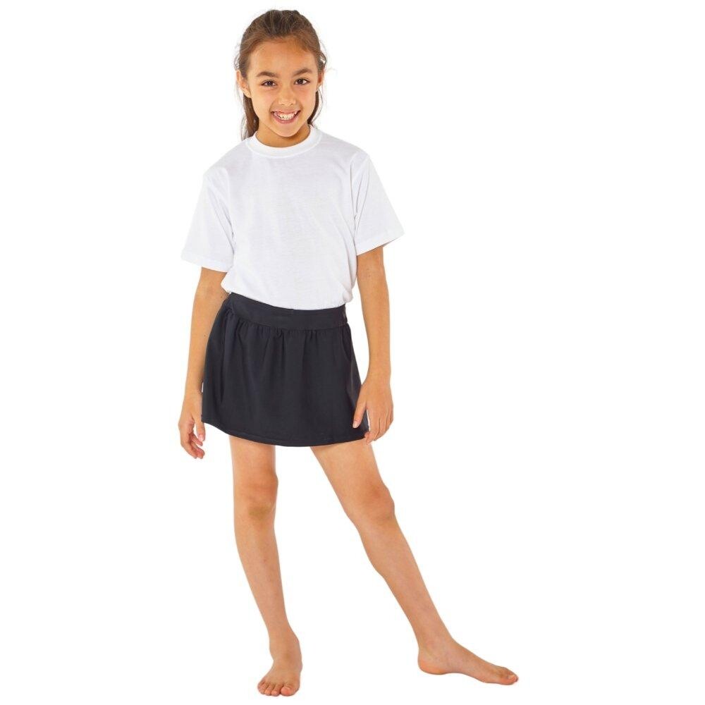 Однотонные школьные шорты для девочек. Короткая юбка А-силуэта с пришитыми внутренними шортиками, длина до середины бедра. Идеально подходит для школьных занятий по плаванию, для бассейна, пляжа, тренировок и других видов спорта. Гибкая, быстросохнущая ткань, устойчивая к хлорированной и соленой воде. Код стиля: 01-25631WE.
