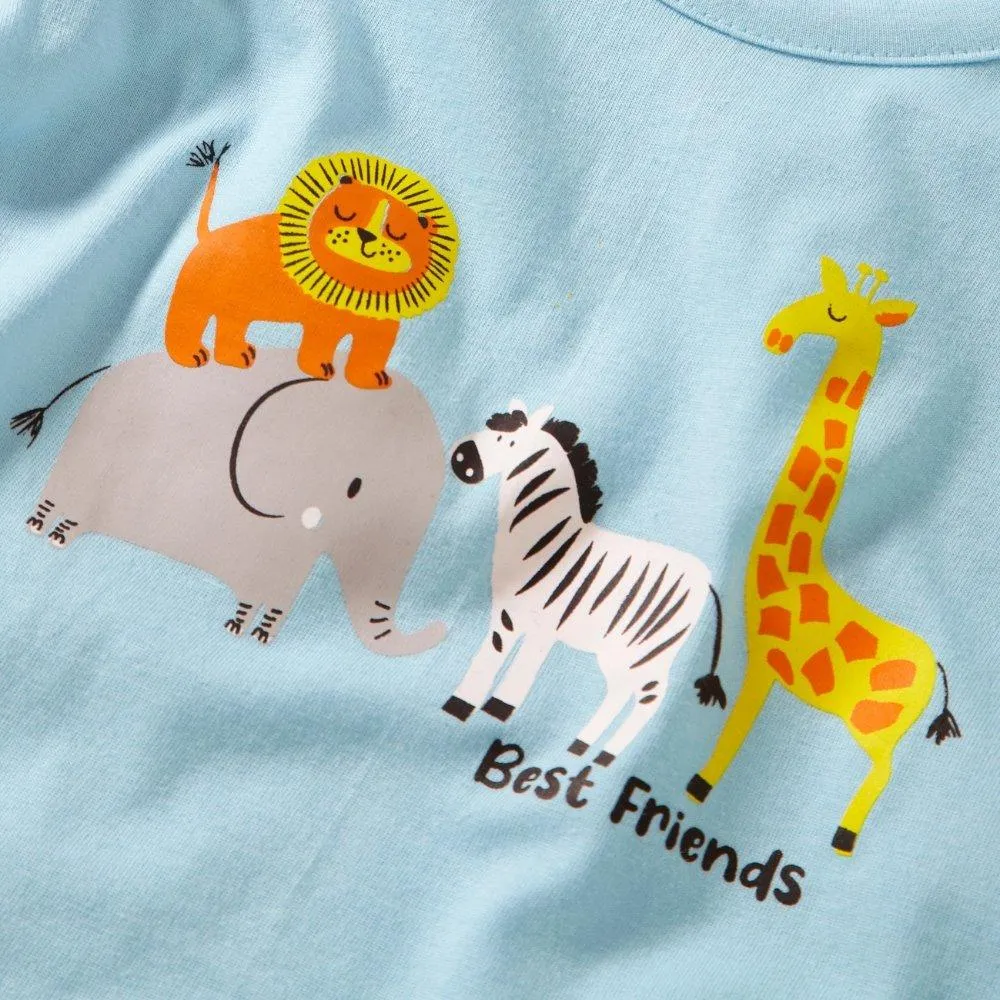 Комплект из двух трикотажных пижам для мальчика. Симпатичный принт с изображением животных из джунглей сверху и соответствующий низ с принтом, а также эластичная талия. Код стиля: 01-BPJ14.