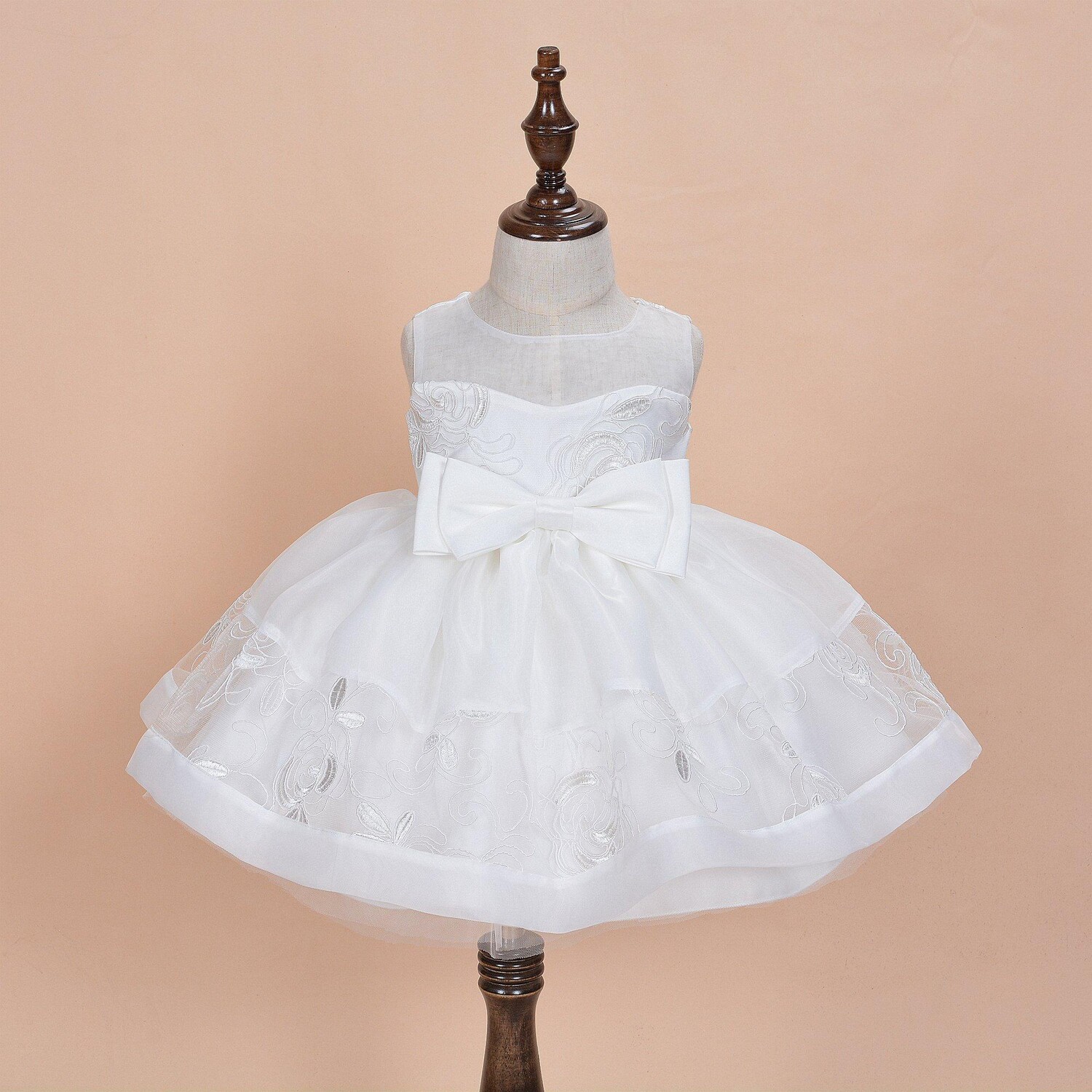 Верх лифа из органзы, низ лифа из атласа с тонкой внешней сеткой и декоративной цветочной окантовкой. Объемный бантик на талии. Пятислойная юбка. Потайная молния сзади. Капюшон в тон из органзы, тонкая внешняя сетка и декоративная цветочная окантовка. Болеро и туфли