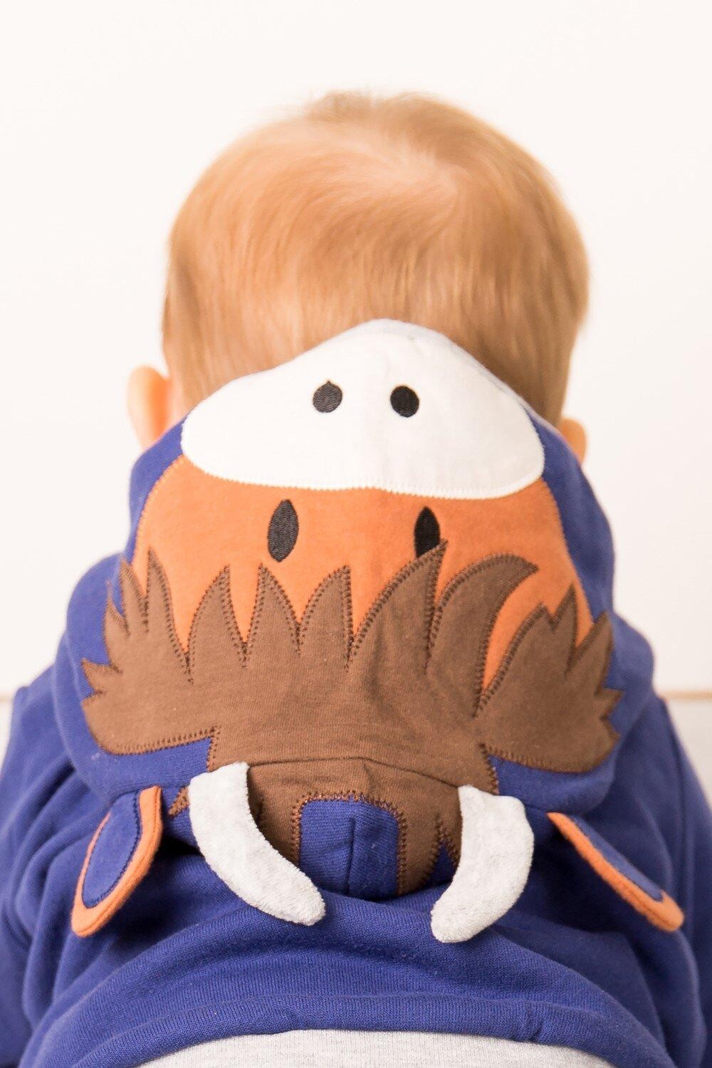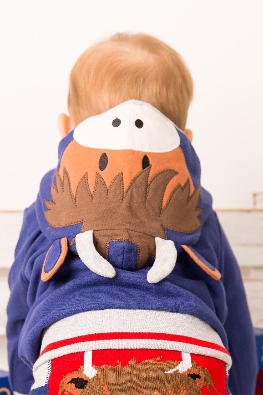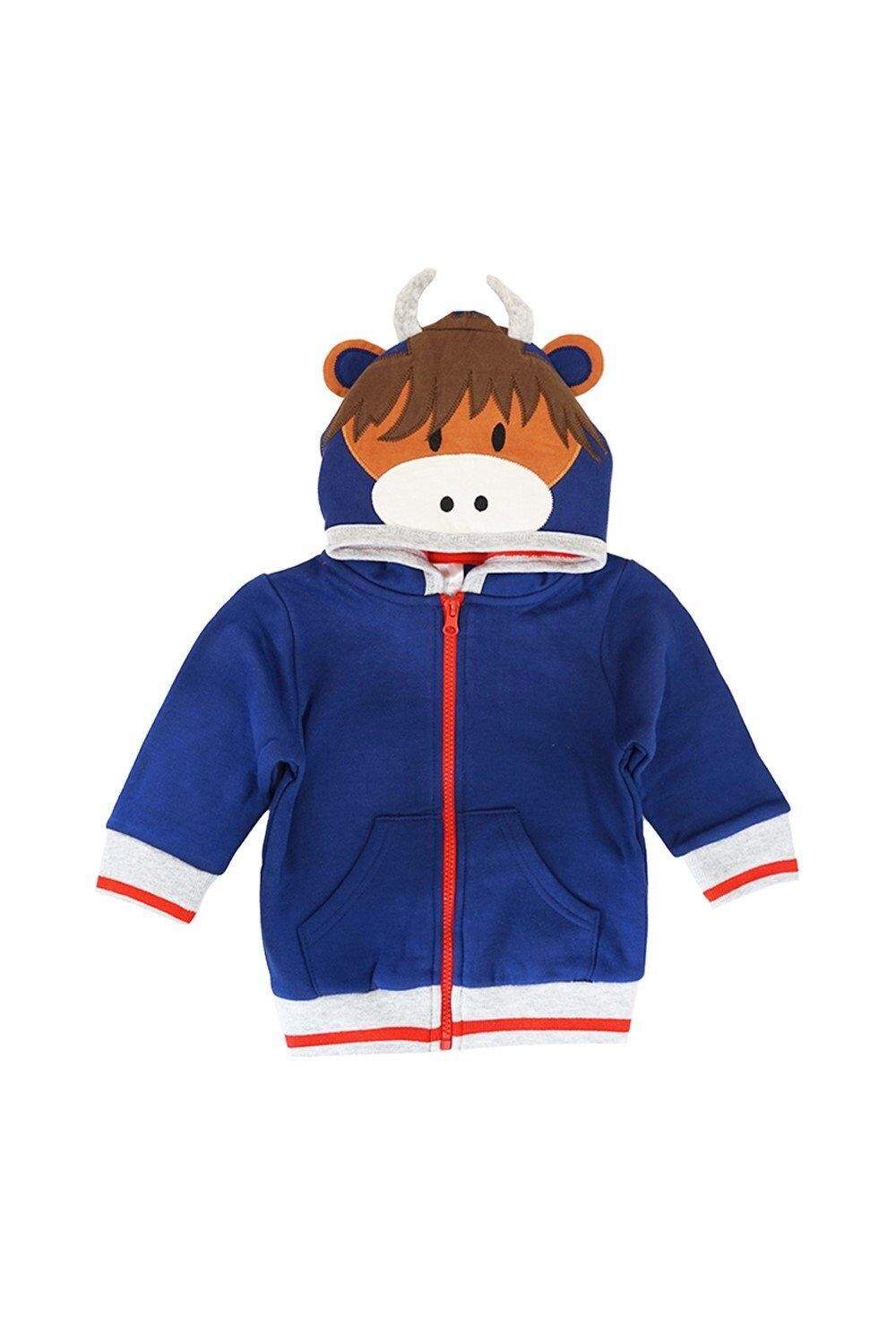 Наша темно-синяя худи имеет капюшон с изображением знаменитой морды хайлендской коровы с веселыми ушами и рогами. Идеально, если ваш малыш любит выделяться из толпы или любит что-нибудь, связанное с природой!