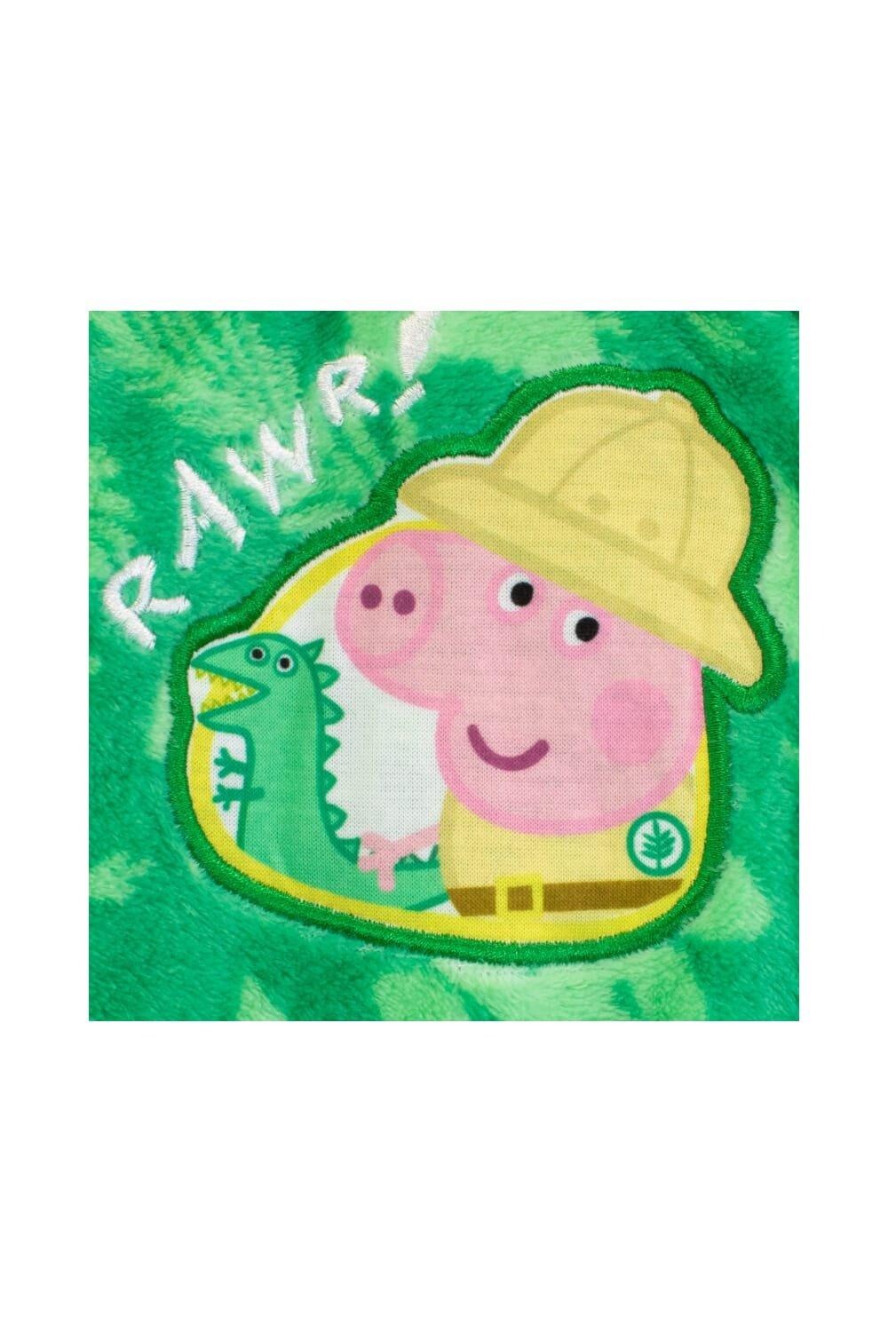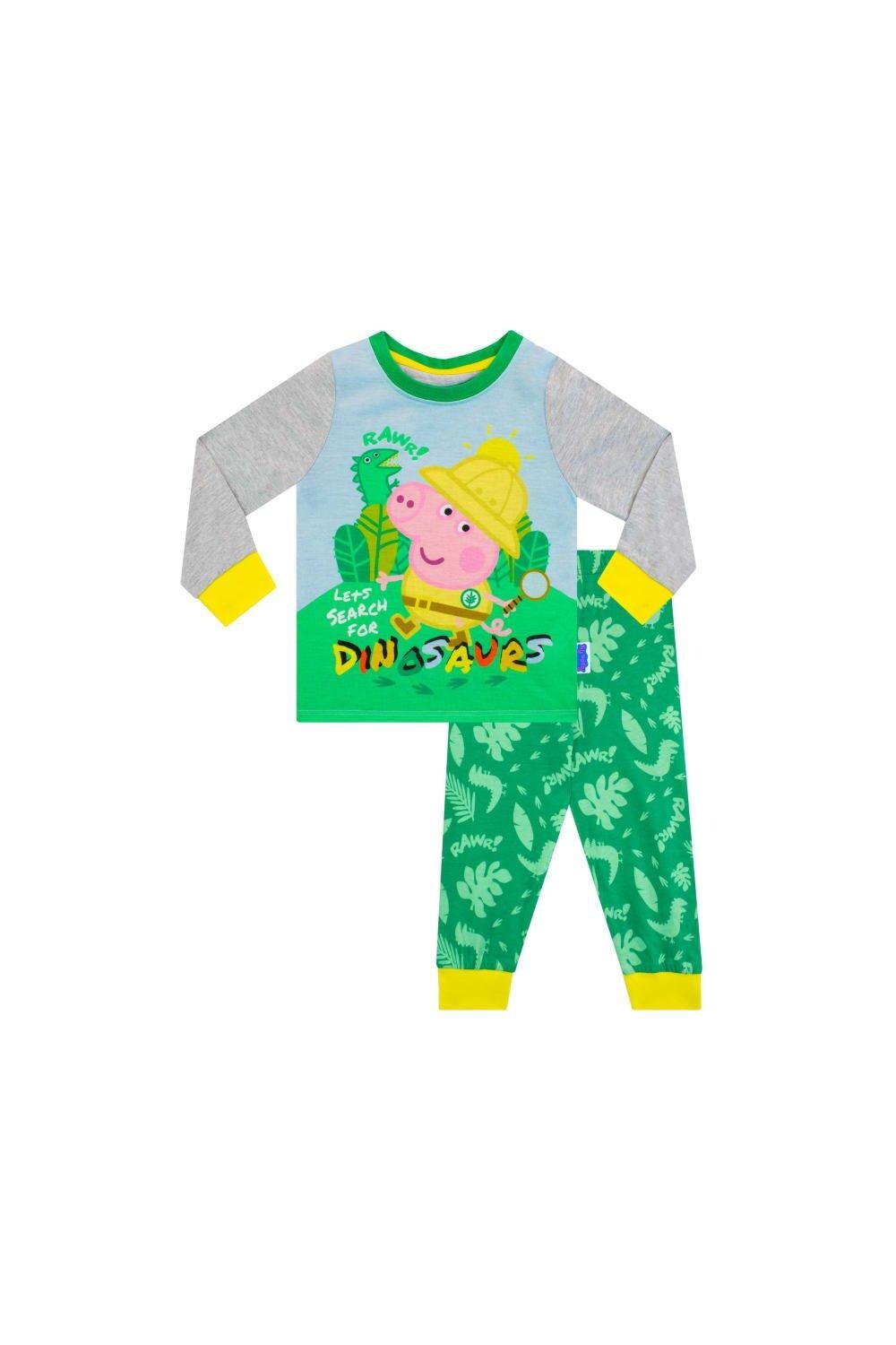 Приготовьтесь к жаркому вечеру в этом халате и пижаме George Pig! В комплект входит зеленый халат с принтом в виде листьев, желтая окантовка и галстук. В сочетании с пижамой подходящего цвета со свиньей Джорджем с увеличительным стеклом и надписью «Давайте поищем динозавров». Ваш маленький любитель динозавров будет готов исследовать свои мечты в этом уютном наборе для сна!