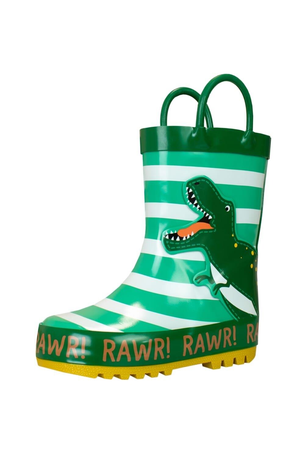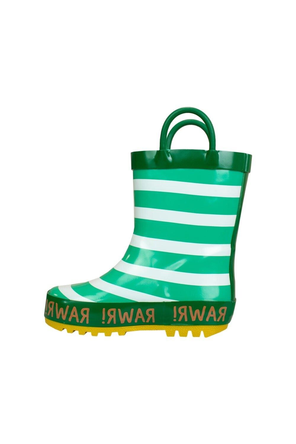 Рор!! Вашему маленькому поклоннику динозавров понравится топать по лужам, как тираннозавра, в этих ревущих резиновых сапогах! Эти резиновые сапоги в зелено-белую полоску, созданные Гарри Беаром, украшены трехмерным значком динозавра сбоку и надписью «Rawr!». напечатан вокруг основания. В комплекте имеются ручки, благодаря которым эти ботинки можно легко надевать и снимать! Идеальная обувь для грязных приключений Юрского периода!
