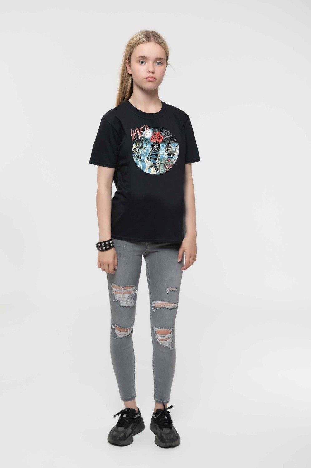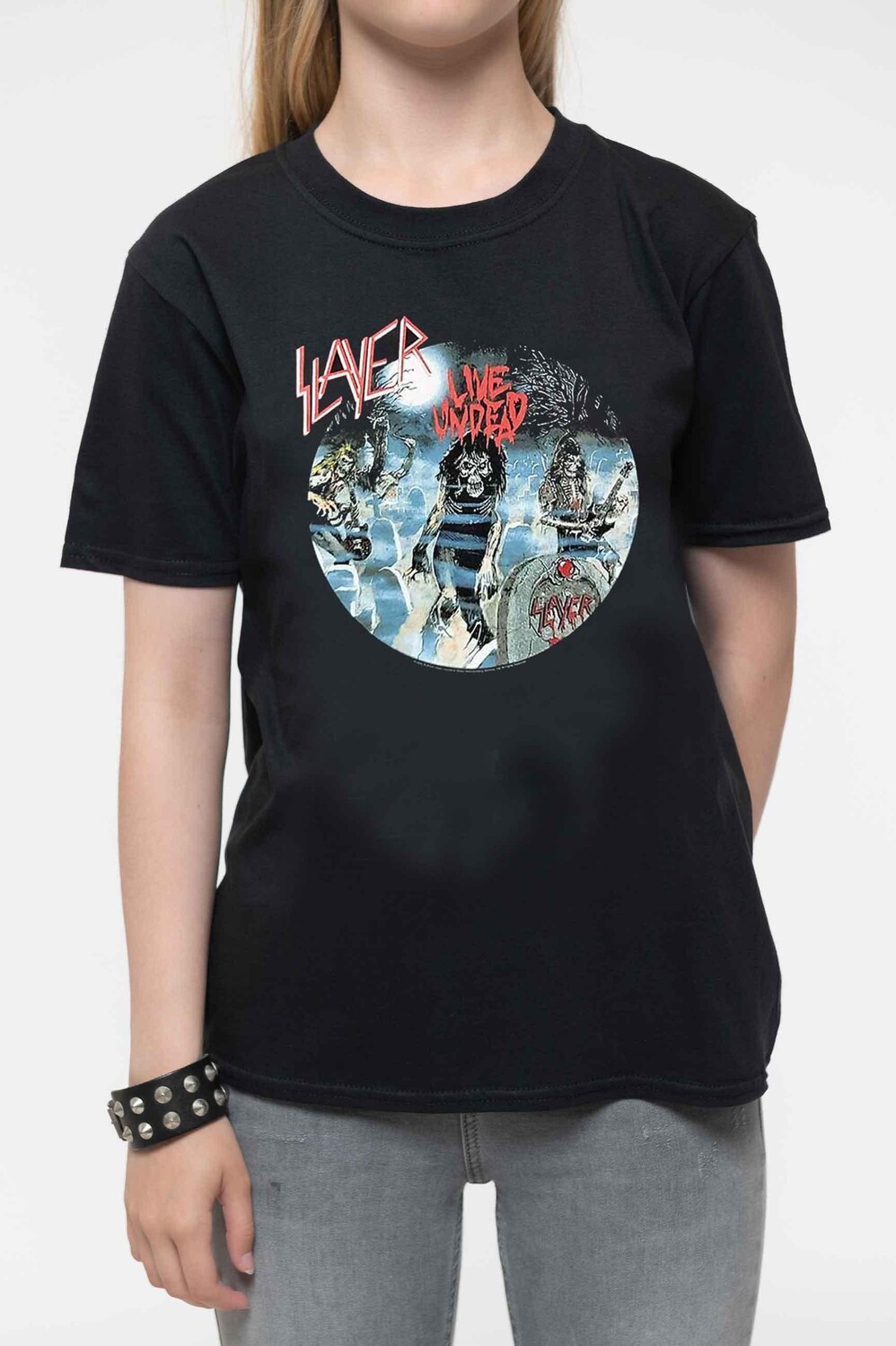 Официально лицензированная детская футболка с мотивом Slayer «Live Undead». Эта высококачественная футболка доступна в черном цвете. Классическая детская футболка унисекс с круглым вырезом и короткими рукавами, изготовленная из мягкого хлопка. Поставляется в широком диапазоне размеров от 5 до 13 лет в зависимости от наличия.