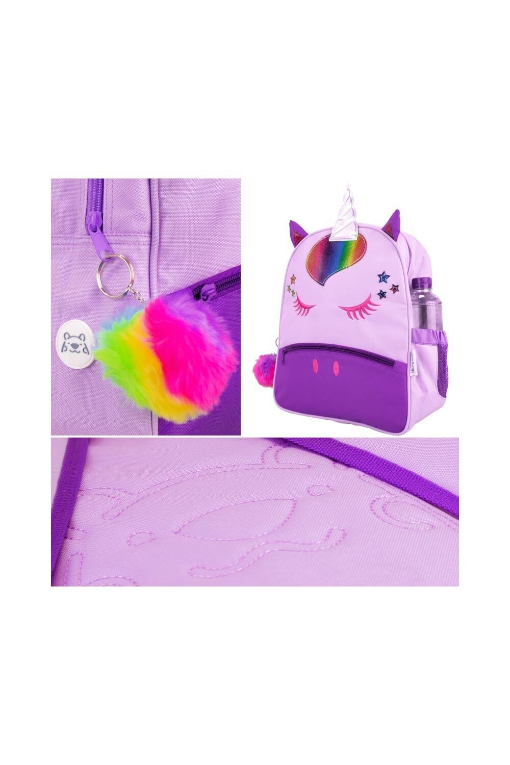 Приблизительные размеры: В:35 x Ш:28 x Г:10см. Добавьте немного волшебства в свои приключения с этим блестящим рюкзаком-единорогом! Этот фиолетовый рюкзак, созданный Гарри Беаром, украшен очаровательным единорогом со множеством забавных деталей, включая трехмерные рога и уши, вышивку и аппликации с блестящими звездами и гривой. Меховой брелок с радужным помпоном на молнии придает еще больше волшебного цвета! Эта сумка-единорог также имеет вместительный внутренний сетчатый карман и боковой карман для хранения всех сокровищ, а также передний карман на молнии. Петля для подвешивания и бирка с именем внутри делают эту сумку идеальной для школы или однодневных поездок. Бутылка в комплект не входит.
