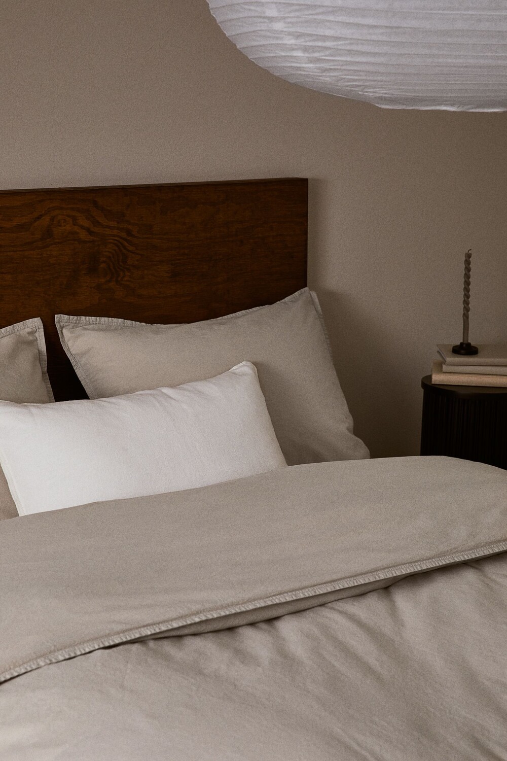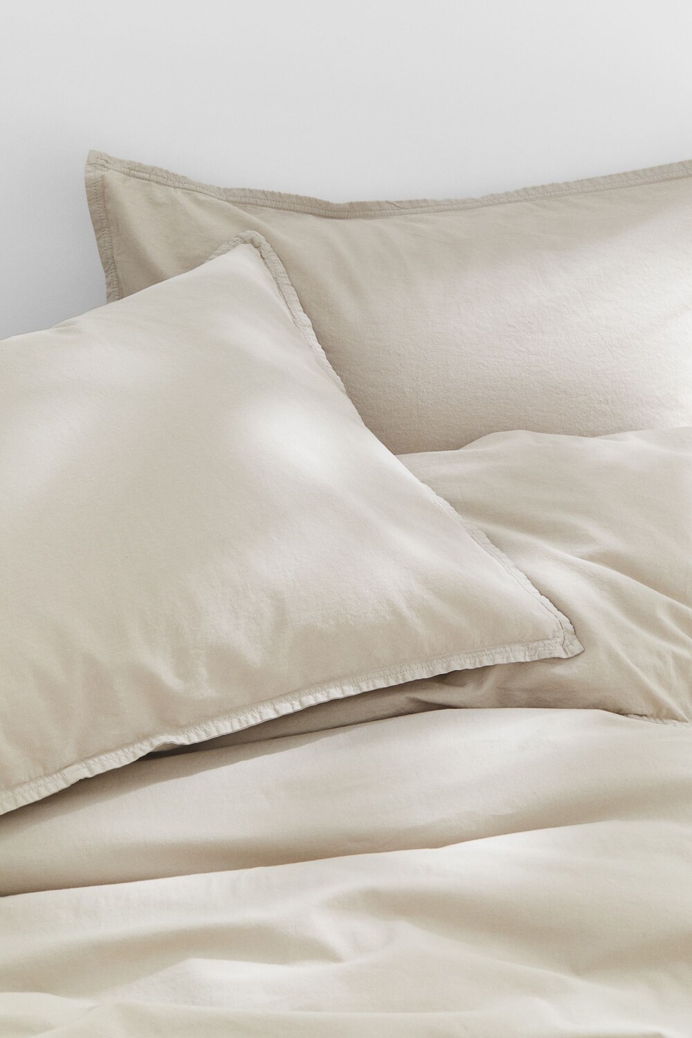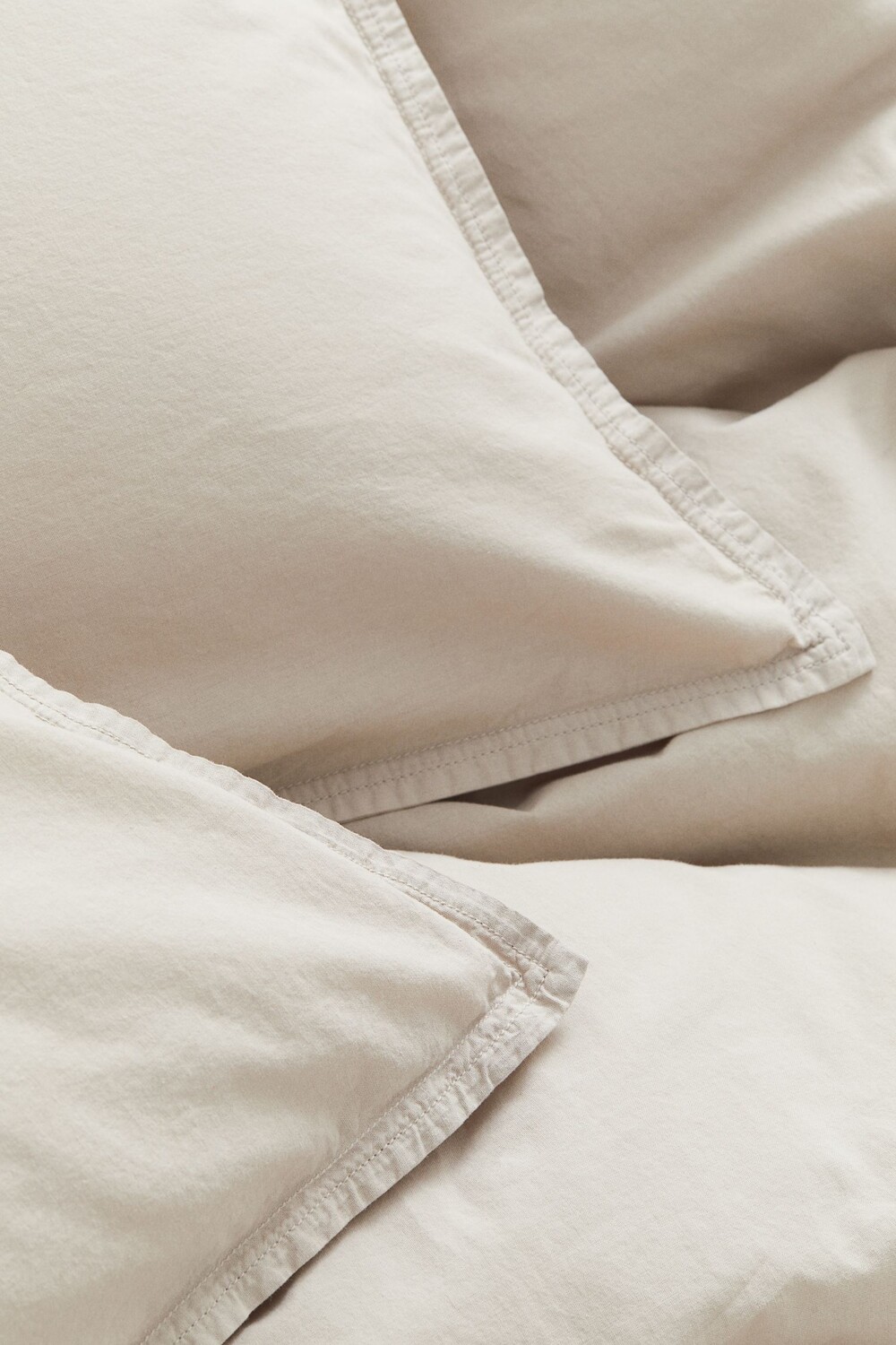 Двуспальное постельное белье из стираной хлопчатобумажной ткани. Плотность 143 ТС. Застежка на металлические кнопки внизу пододеяльника. В комплекте две наволочки-конверта.