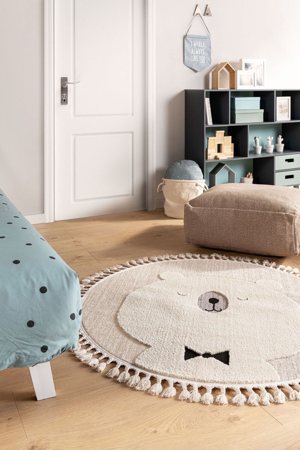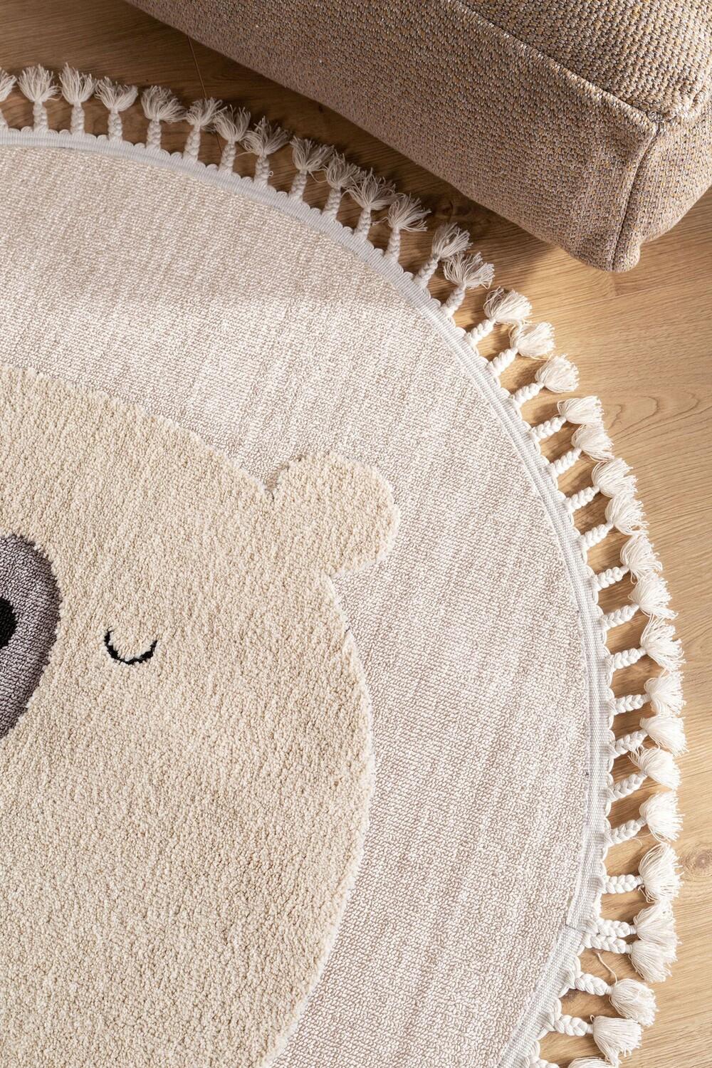 Детский коврик Momo соткан машинным способом из 100% полиэстера. Ковер Lytte кремового цвета с принтом "мишка". Диаметр: 120 см.