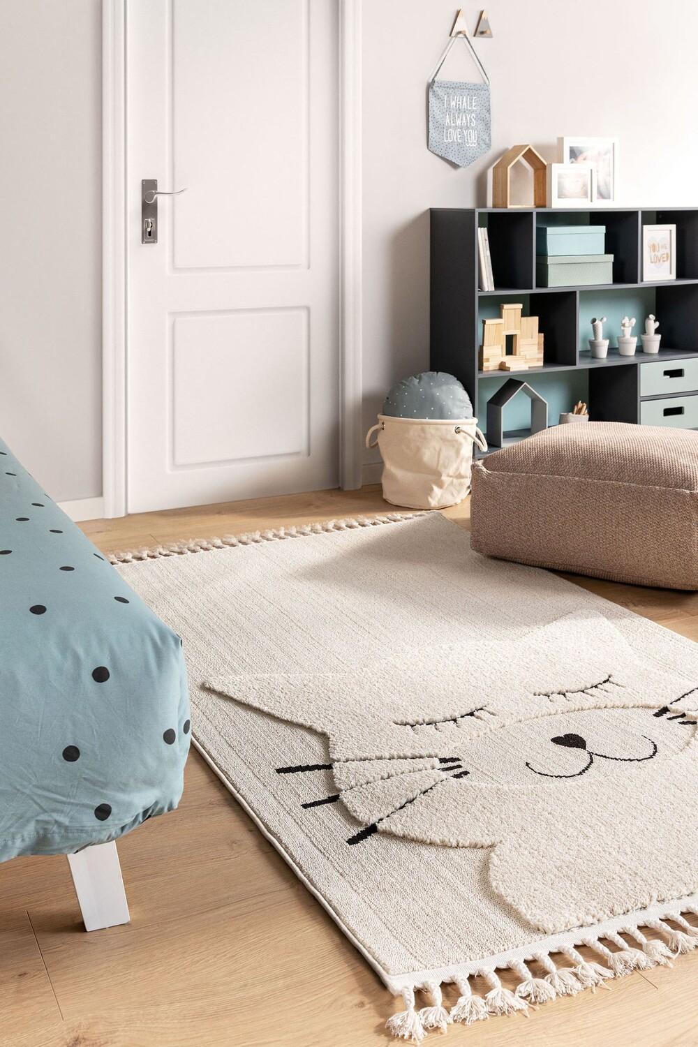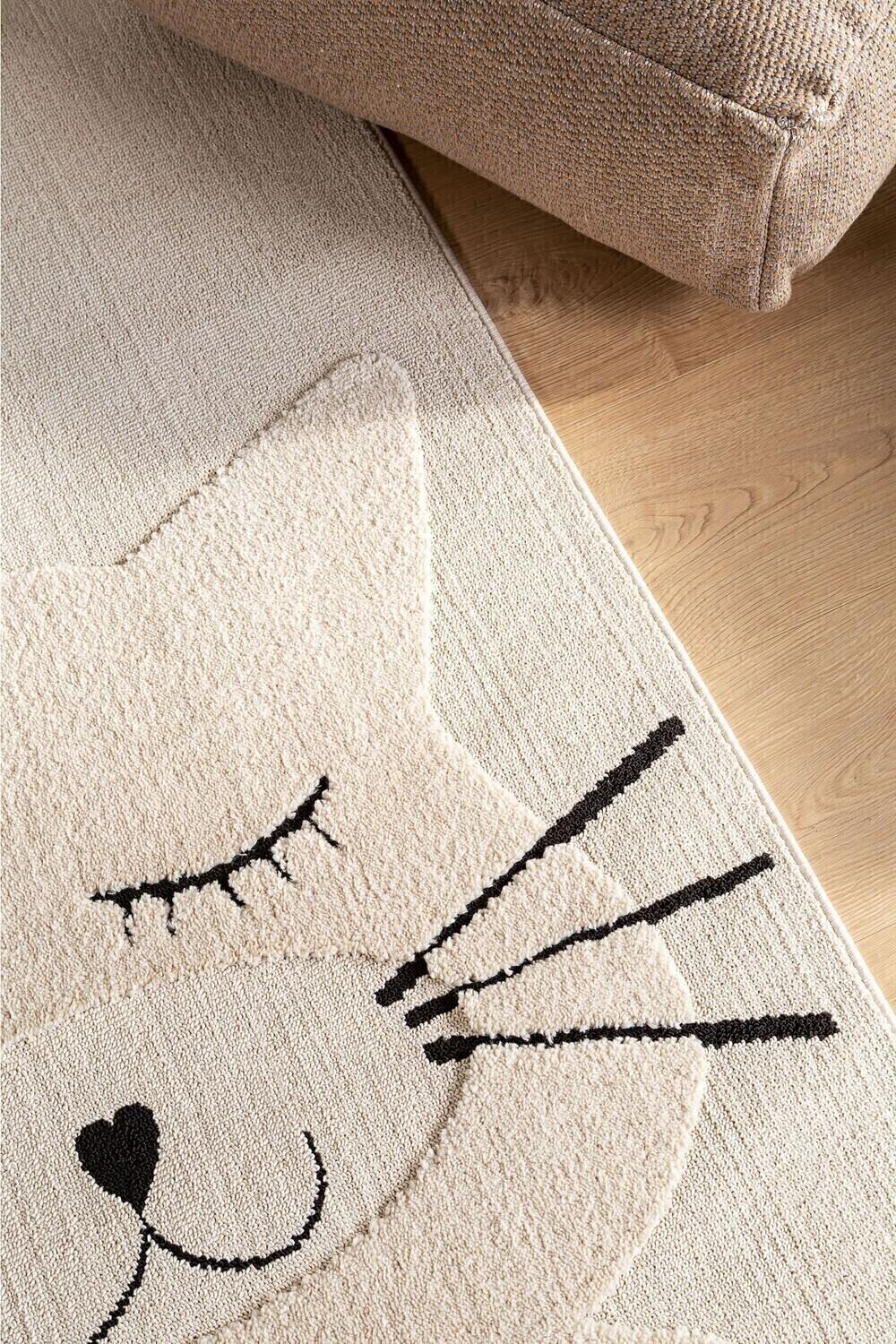 Детский коврик Momo соткан машинным способом из 100% полиэстера. Ковер Lytte кремового цвета с принтом "кот". Размеры изделия: 120х180 см.