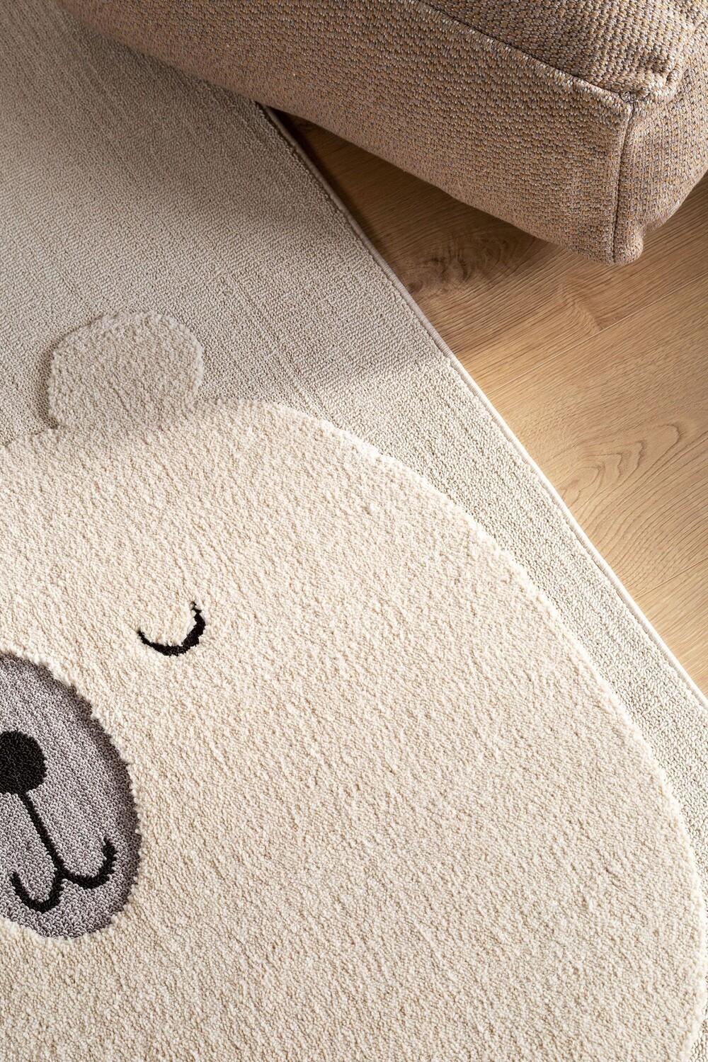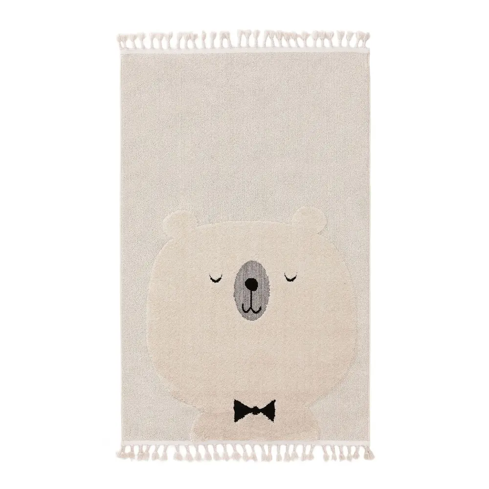Детский коврик Momo соткан машинным способом из 100% полиэстера. Ковер Lytte кремового цвета с принтом "мишка". Размеры изделия: 90х130 см.