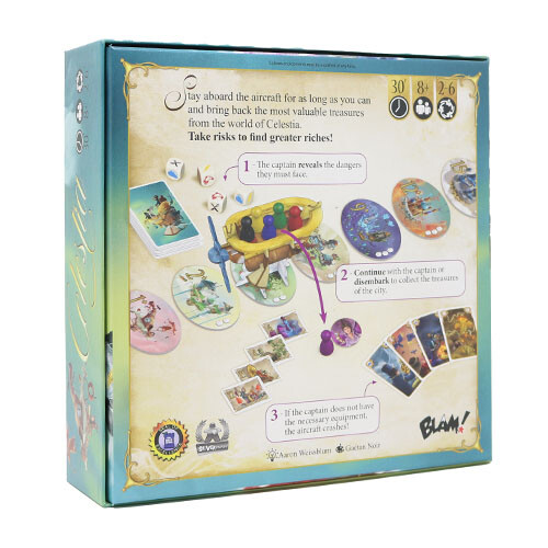 • В небо на нашем шатком корабле! У Селестии есть группа авантюристов, пытающихся испытать удачу, пытаясь перемещаться по коварному небу между плавучими островами в поисках сокровищ и богатств. В игре «Селестия» у каждого игрока есть колода карт, которая помогает ему преодолеть одну из четырех опасностей, встречающихся в небе. Каждый игрок по очереди становится капитаном и должен бросить кубик, чтобы увидеть, с какими опасностями столкнется корабль. Все остальные должны решить, считают ли они, что у нынешнего капитана есть необходимые карты, чтобы продвинуться и преодолеть эти препятствия, или покинуть корабль и взять карту сокровищ с текущего острова. Если у капитана есть нужные карты, корабль летит вперед, и следующий игрок становится капитаном, если нет, корабль падает с неба, унося с собой всех. Специальные карты позволяют облегчить путешествие или даже усложнить его, если вы хотите, чтобы оно провалилось. И вы можете захотеть, чтобы это провалилось, если вы спрыгнули слишком рано, и ваши противники направляются на острова, наполненные ценными сокровищами. Игра представляет собой гонку, и побеждает тот, кто первым наберет 50 очков сокровищ. Celestia — это причудливая семейная игра «Испытай удачу» с элементами управления руками. Он прекрасно смотрится на столе и поставляется с трехмерной лодкой, в которую можно разместить все фигуры игроков. Игроки: 2–6. Время игры: 30 минут. Возраст: 8+.
