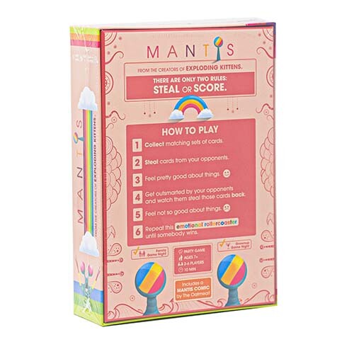MANTIS от команды, создавшей веселую игру для вечеринок Exploding Kittens, — это рог изобилия быстрой и красочной карточной игры! В MANTIS всего два правила; украсть или забить. Игроки по очереди вытягивают верхнюю карту из колоды. На обратной стороне каждой карты изображена радуга плюс три цвета (включая уникальные символы). На лицевой стороне изображена креветка-богомол одного из этих цветов. Не глядя вперед, активный игрок выбирает, получить ли ему один из этих трех цветов из карт в своей коллекции или (2) украсть карту у противника. При подсчете очков цвет должен соответствовать костюму, уже присутствующему в вашей коллекции. Если это так, все эти карты переворачиваются радужной стороной и помещаются под вашу коллекцию. Если вам повезет, карта будет добавлена в вашу коллекцию для дальнейшего подсчета очков (или кражи!). В случае кражи цвет должен совпадать с цветом карт в коллекции вашего противника. Когда вы найдете совпадение, вы сможете добавить эти карты в свою коллекцию. Но если этого не происходит, противник оставляет эту карту себе. MANTIS — это очень простая в освоении, быстрая и веселая карточная игра для всех возрастов. Если вам нравятся быстрые игры на удачу с множеством взаимодействий между игроками, которые просто бросаются в глаза, эта игра для вас!