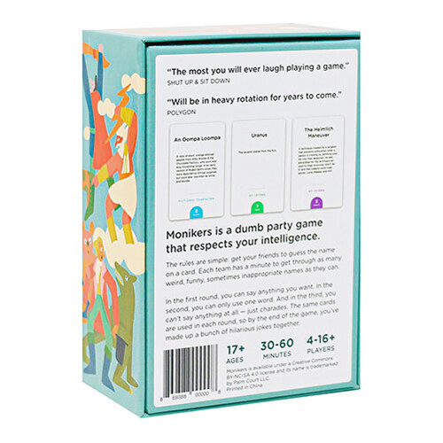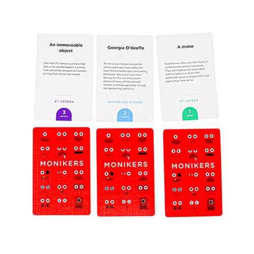 • Monikers — это игра для вечеринок, основанная на общедоступной игре Celebrity, в которой игроки по очереди пытаются заставить своих товарищей по команде угадывать имена, описывая или подражая известным людям. В первом раунде дающие подсказки могут говорить все, что хотят, кроме самого имени. Во втором раунде дающие подсказки могут сказать только одно слово. А в финальном раунде подсказчики вообще ничего не могут сказать: они могут использовать только жесты и шарады. На основе общедоступной игры, известной как Celebrities. Количество игроков: 4-16. Время: 30-60 минут. Возраст: 17+