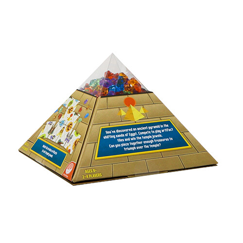 Квест на подбор артефактов и получение драгоценностей! «Вы обнаружили египетскую пирамиду, наполненную храмовыми драгоценностями и древними артефактами, требующими ремонта. Вам предстоит исправить их, чтобы получить в награду драгоценности храма. На ваших картах квестов указано, какие артефакты вы можете исправить в свой ход. Игрок, который соберет больше всего драгоценностей, одержит победу над храмом. ». — описание из книги правил. В этой игре у вас на руках 3 плитки. Затем вы вытягиваете из колоды карту квеста, и она сообщает вам, какие артефакты, перечисленные на плитках, принесут вам очки в этом ходу. Сопоставьте как можно больше символов на картах, и за каждое правильное совпадение вы получите драгоценный камень. Игроки: 2-4. Продолжительность: 20 мин. Возраст: 8+