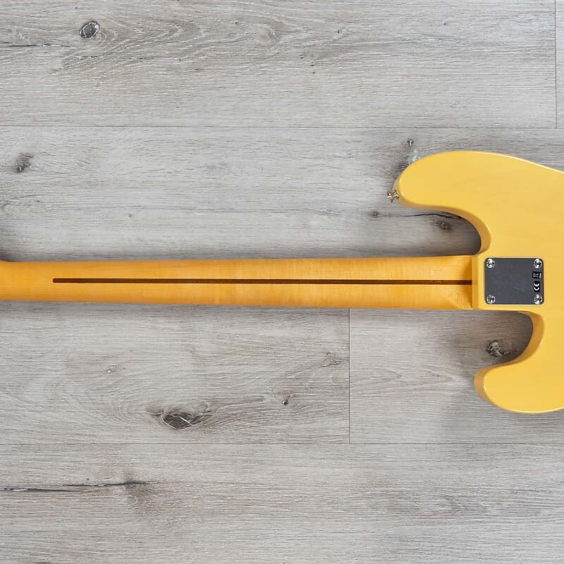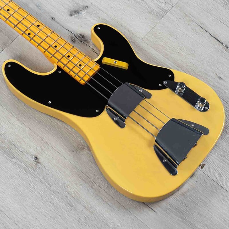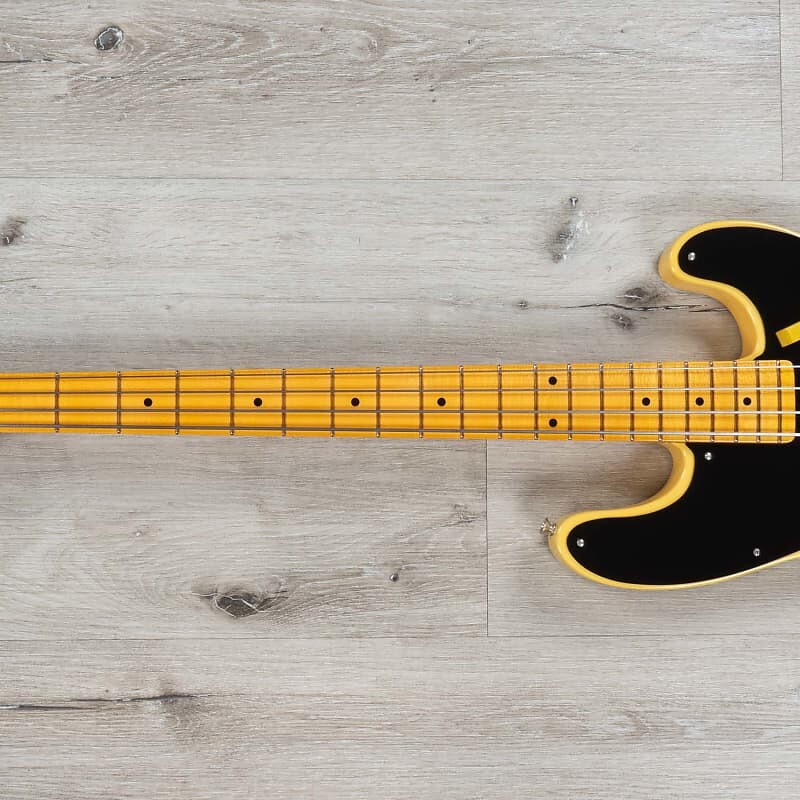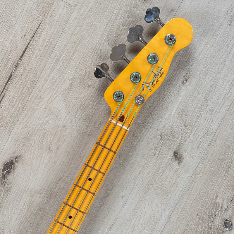 Другие особенности Vintage Custom 1951 Precision Bass включают фурнитуру Closet Classic, корпус из двух частей ясеня, 20 винтажных ладов, звукосниматель '55 P Bass, регуляторы громкости и тембра, однослойную черную накладку, костяной порожек, круглую струну. фиксатор и колки в винтажном стиле.