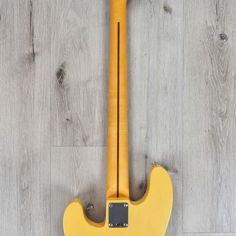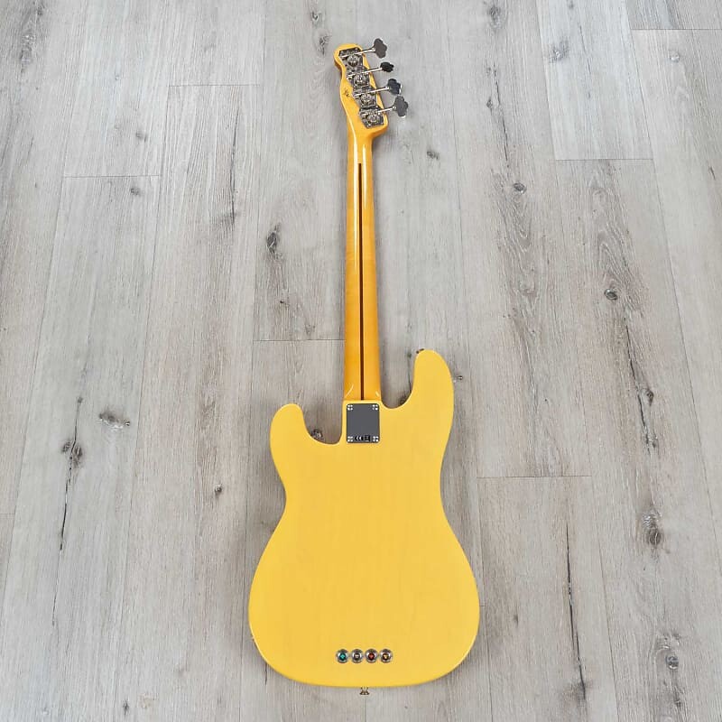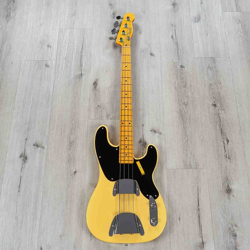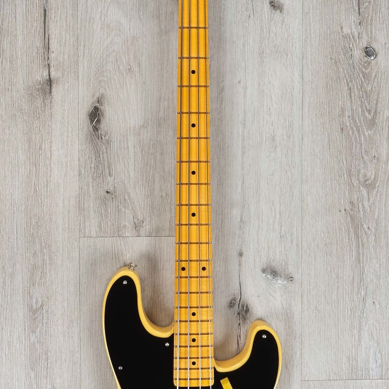Другие особенности Vintage Custom 1951 Precision Bass включают фурнитуру Closet Classic, корпус из двух частей ясеня, 20 винтажных ладов, звукосниматель '55 P Bass, регуляторы громкости и тембра, однослойную черную накладку, костяной порожек, круглую струну. фиксатор и колки в винтажном стиле.