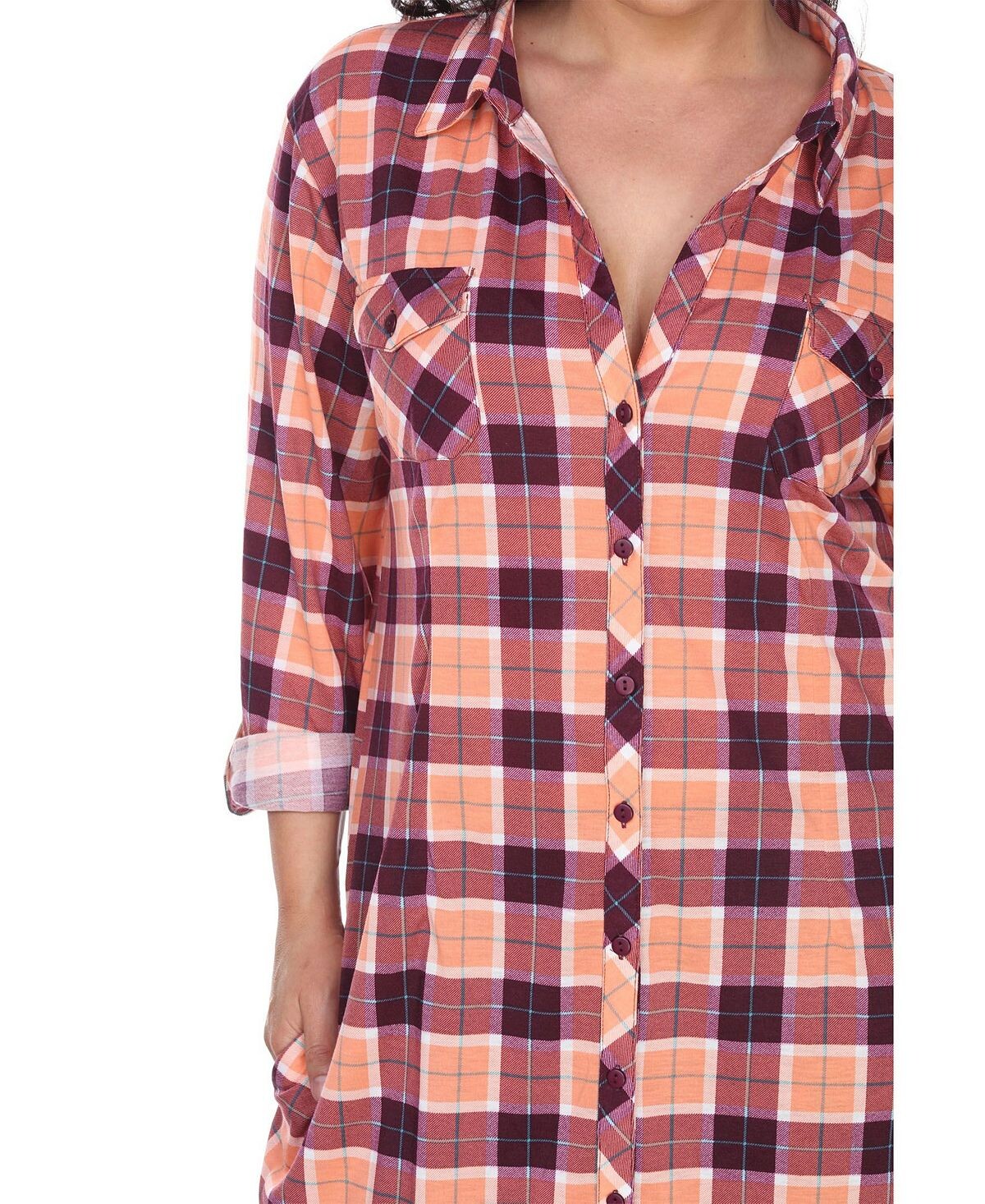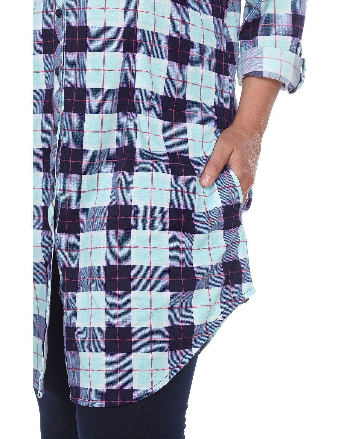 Наша туника с пуговицами спереди, мягкая и легкая, украшена сплошным узором в клетку из эластичного трикотажа, окрашенного в пряжу. Длинные рукава с закатанными манжетами на пуговицах и хлястиком длиной 3/4.