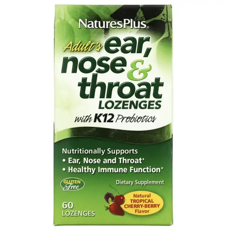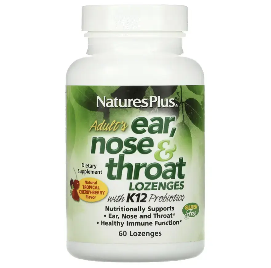 Добавка для ушей, горла, носа, леденцы для взрослых от NaturesPlus способствуют формированию здоровой микрофлоры ушей, горла и носа благодаря передовым пробиотикам K12