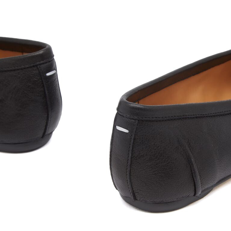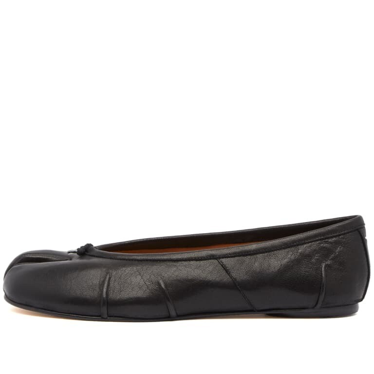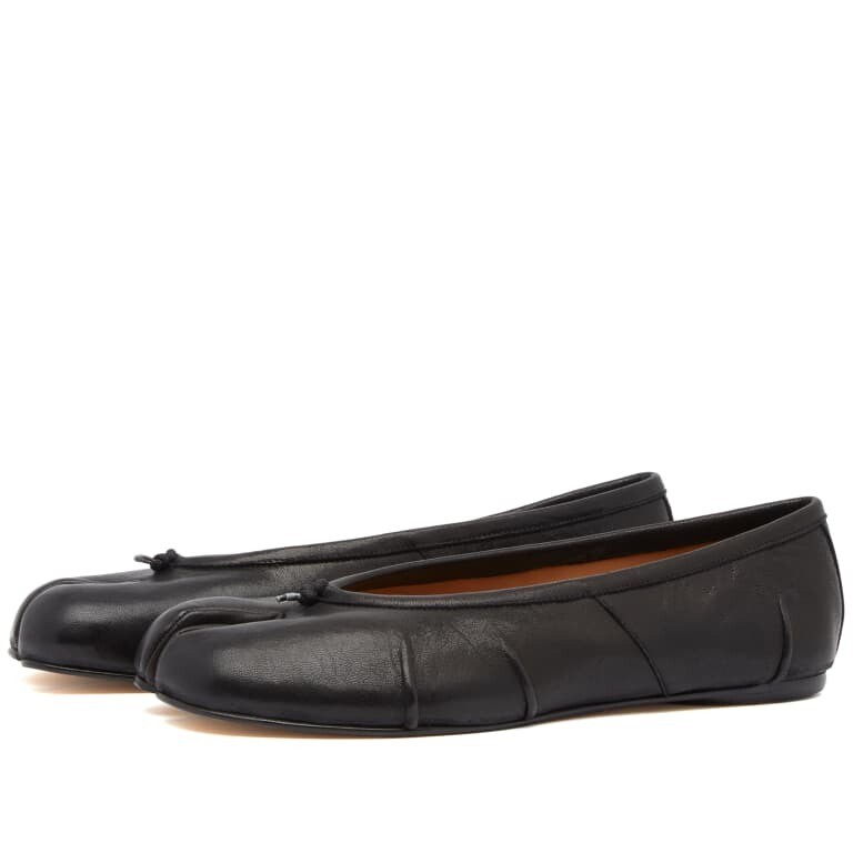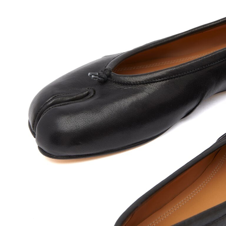 Эти туфли Ballerina Tabi от роскошного бренда Maison Margiela с уникальным раздвоенным носом, напоминающим традиционный японский стиль, гарантируют современный и культурный акцент в вашем образе. Они изготовлены из гладкой черной кожи и украшены изящным узлом спереди, который является синонимом классических туфель-лодочек Ballerina.