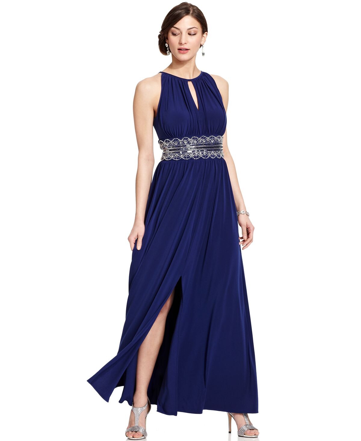 Сделайте ошеломляющий эффект в этом миниатюрном вечернем платье от R&M Richards с сексуальным дизайном каплевидного выреза, расшитой бисером талией в стиле ампир и соблазнительной юбкой с разрезом спереди.
