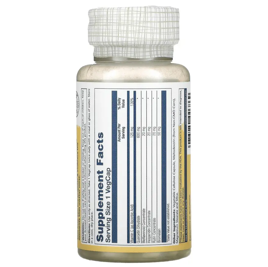 Мега-кверцетин — это мощная комбинация биофлавоноидов кверцетина, рутина и гесперидина. Биофлавоноиды могут помочь поддерживать здоровое состояние носовых пазух, а также дыхательную и иммунную функции. Бромелайн - это растительный фермент, который помогает расщеплять белок. Витамин С обеспечивает антиоксидантную активность и предназначен для поддержания нормального, здорового синтеза коллагена, целостности капилляров и кровеносных сосудов, развития хрящей и костей, иммунной функции и передачи нервных импульсов.
