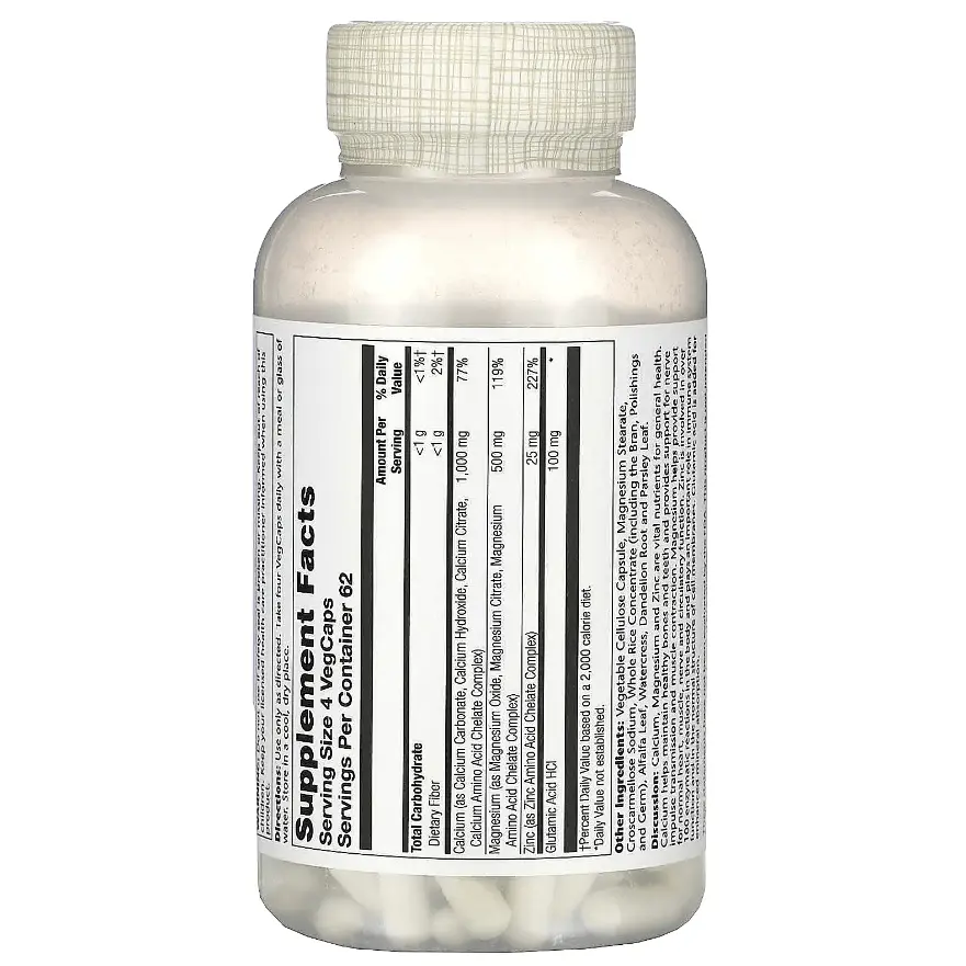 Кальций, магний и цинк являются жизненно важными питательными веществами для общего состояния здоровья. Кальций помогает поддерживать здоровье костей и зубов, обеспечивает передачу нервных импульсов и сокращение мышц. Магний помогает обеспечить поддержку нормальной функции сердца, мышц, нервов и кровообращения. Цинк участвует в более чем 100 ферментативных реакциях в организме и играет важную роль в функционировании иммунной системы и нормальной структуре клеточных мембран. Глутаминовая кислота добавлена для улучшения усвоения минералов.