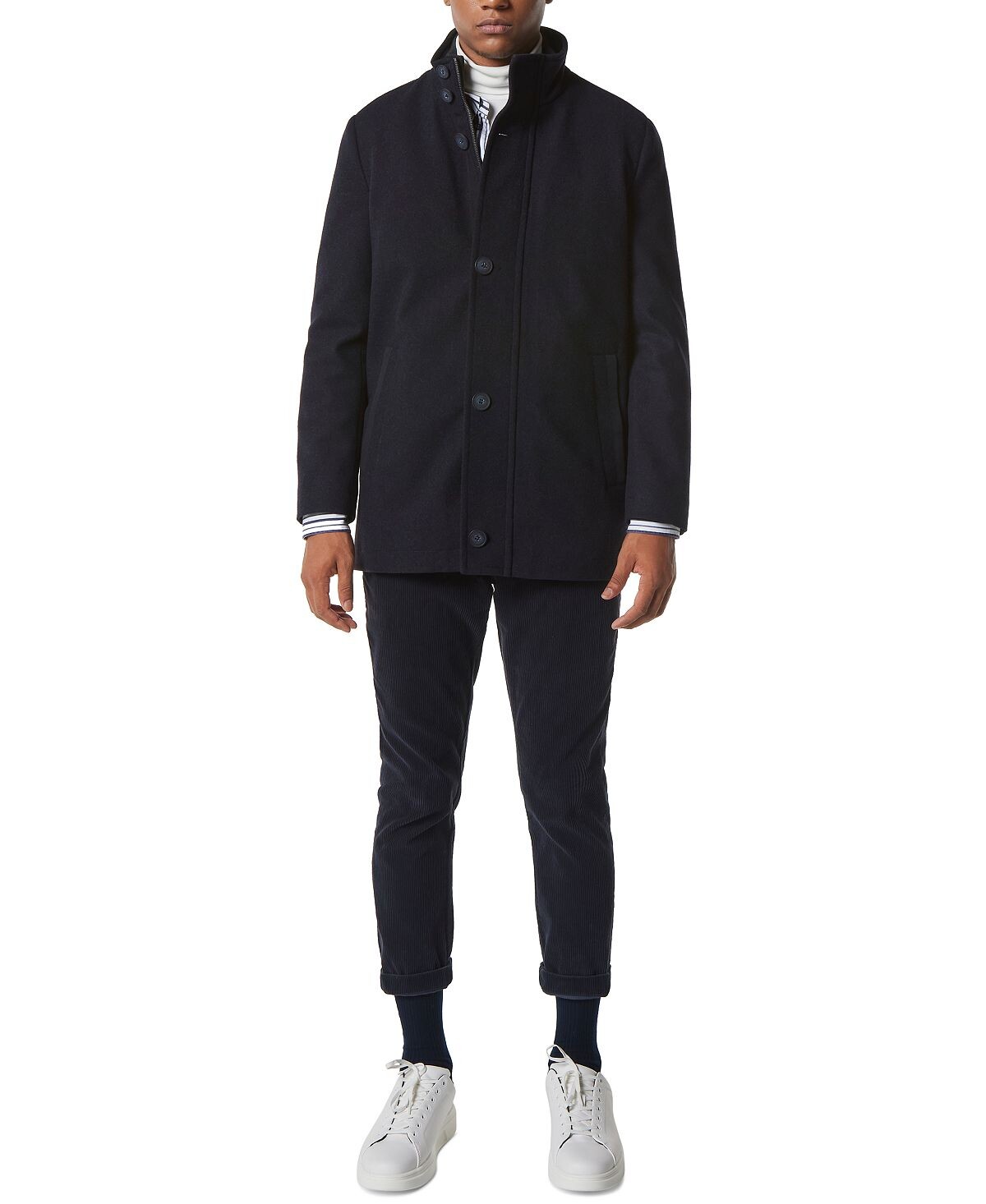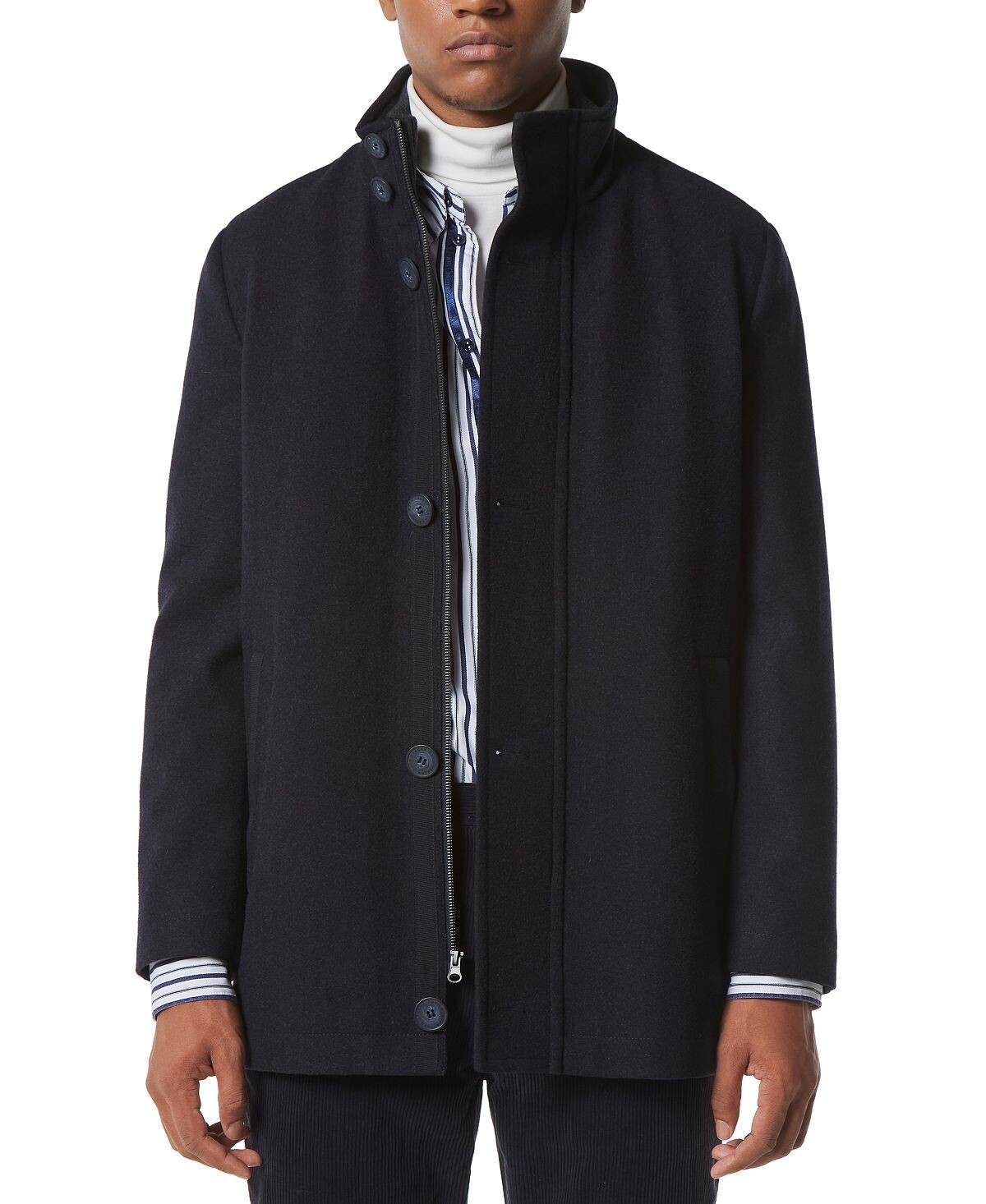 Фирменное автомобильное пальто Марка Нью-Йорка Dorsey скроено из классической мелтоновой ткани и украшено трикотажной резинкой на внутреннем воротнике, создающей ощущение уюта. Этот фасон «бросай и ходи» также имеет воротник-стойку, планку с пуговицами спереди и тесьму из тесьмы вдоль прорезных карманов на теле.